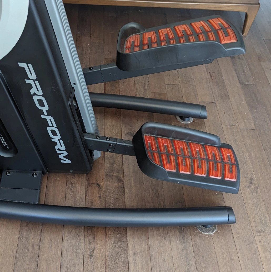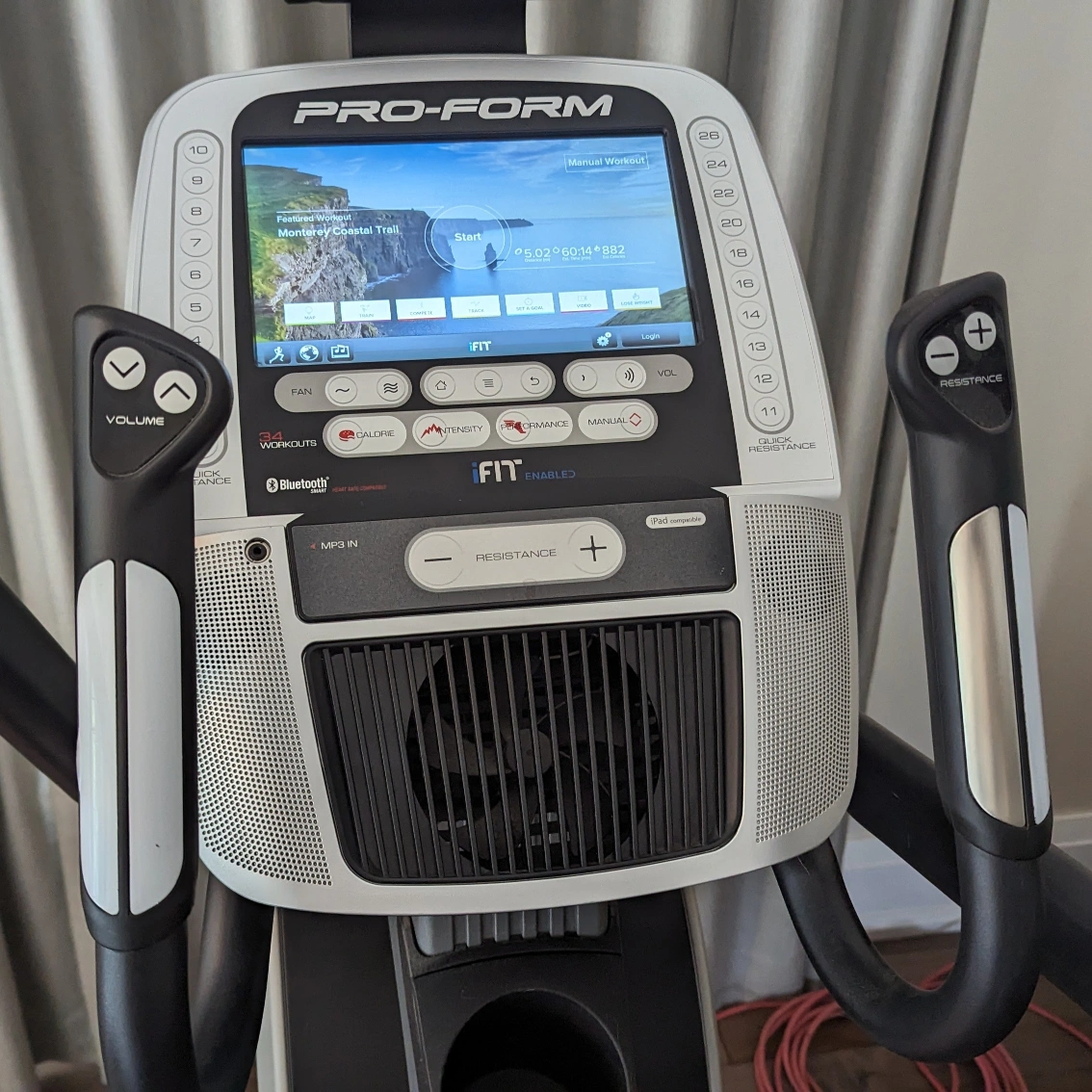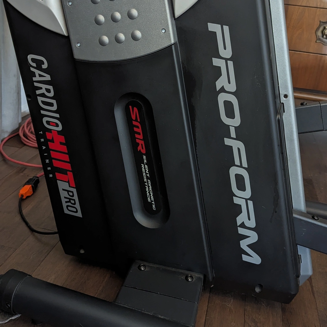 Top quality and silent running. It’s easy to mount a tablet and watch a show during your workout. 10” Smart HD Touchscreen 26 Resistance Levels with SMR™ Silent Magnetic Resistance 30 Lb. Effective Inertia-Enhanced Flywheel Oversized, Cushioned Pedals CoolAire™ Fan Integrated Tablet Holder Front-Mounted Transport Wheels 29.25" W x 52" D x 66.7" H Pickup: Kingston Road & Birchmount Avenue Please Note: Our puppy chewed the on the power cord, so it has been shortened. On one foot pad, there is a broken off bolt head. It doesn’t affect the machine’s performance. We just can’t disassemble the piece.