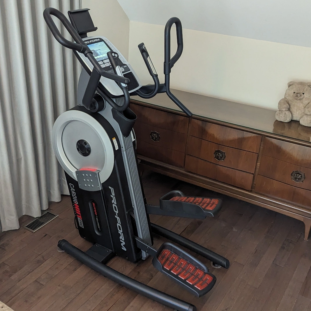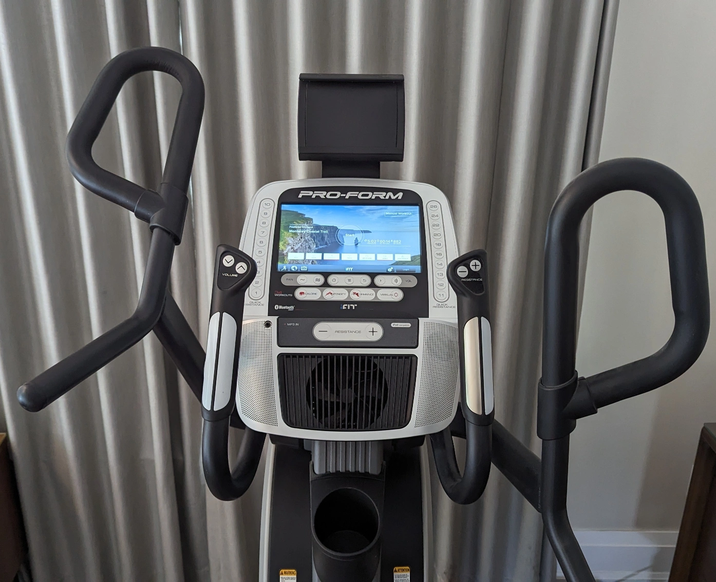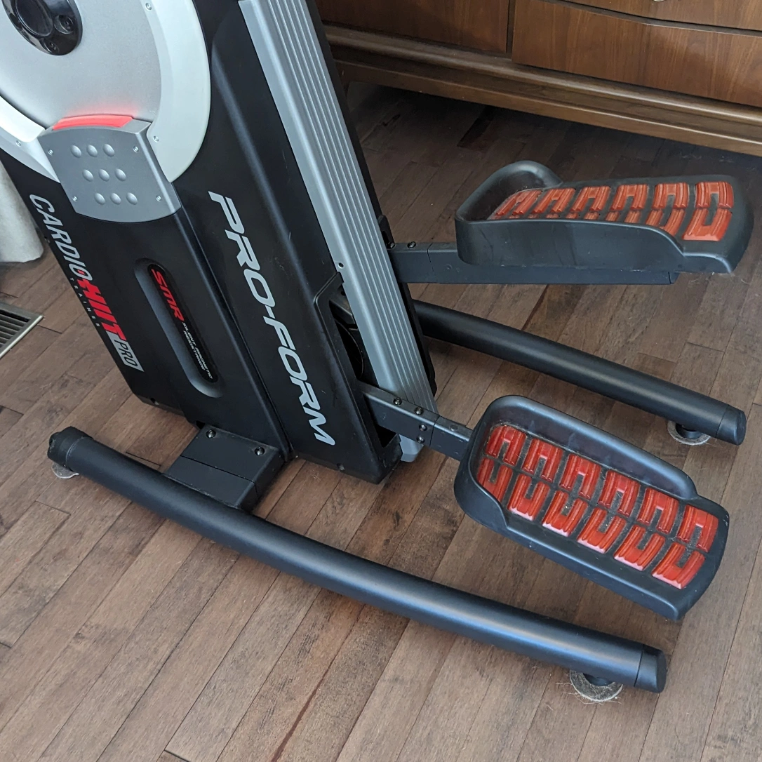 Top quality and silent running. It’s easy to mount a tablet and watch a show during your workout. 10” Smart HD Touchscreen 26 Resistance Levels with SMR™ Silent Magnetic Resistance 30 Lb. Effective Inertia-Enhanced Flywheel Oversized, Cushioned Pedals CoolAire™ Fan Integrated Tablet Holder Front-Mounted Transport Wheels 29.25" W x 52" D x 66.7" H Pickup: Kingston Road & Birchmount Avenue Please Note: Our puppy chewed the on the power cord, so it has been shortened. On one foot pad, there is a broken off bolt head. It doesn’t affect the machine’s performance. We just can’t disassemble the piece.