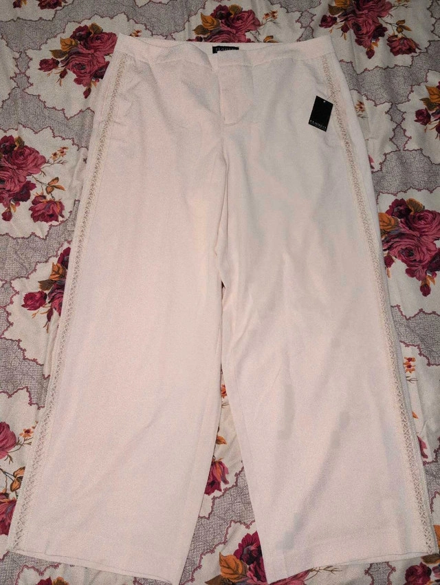 Elevate your wardrobe with these brand new Eloquii wide-leg pants, size 18, featuring stylish crochet detailing down the sides. These pants offer a blend of comfort and chic design, perfect for any occasion. Features: * Brand: Eloquii * Size: 18 * Style: Wide leg with crochet side detail * Condition: New with tags Looking for a stylish addition to your wardrobe? These pants are eager to step out and make a statement. Don't miss out—if the ad is up, they're ready to go!