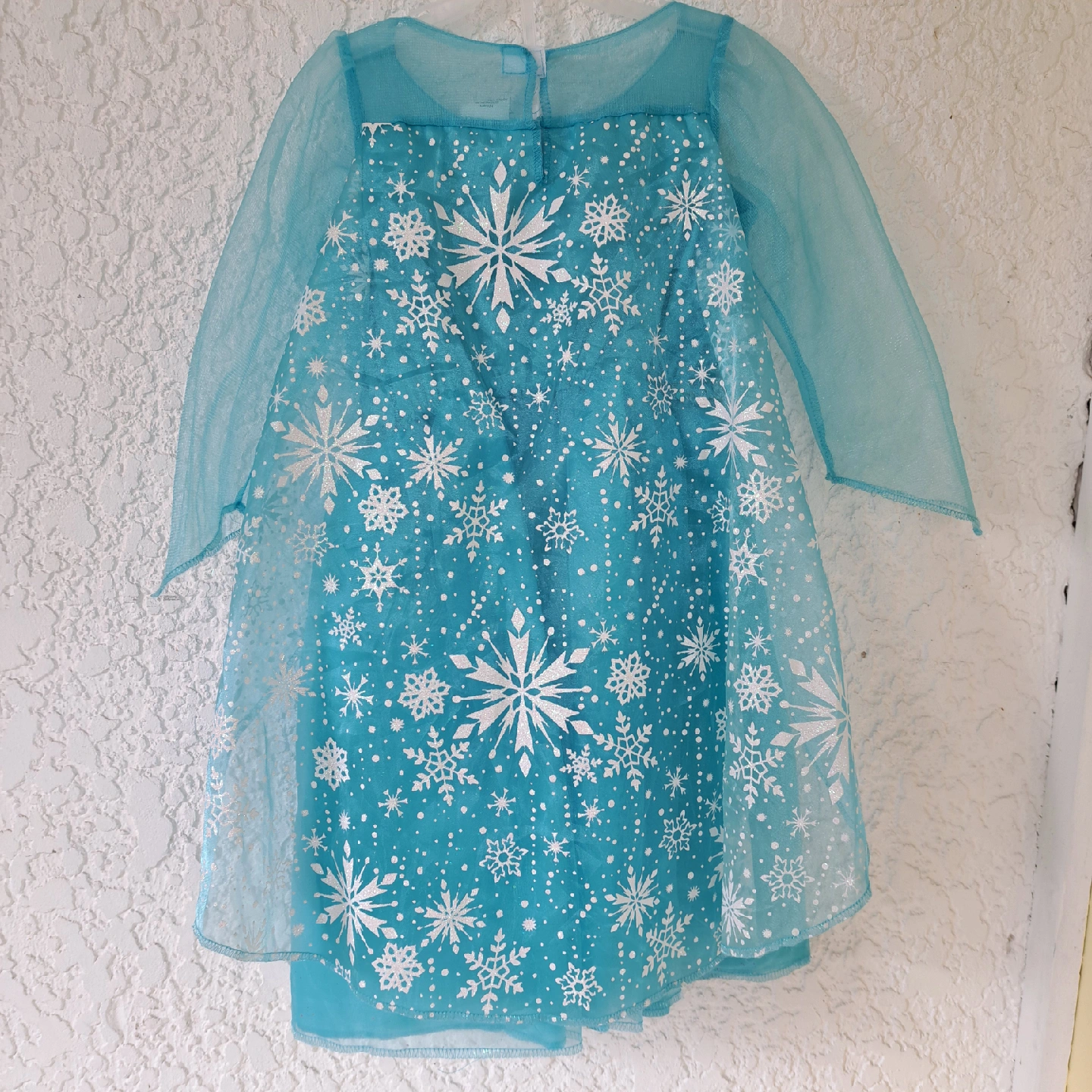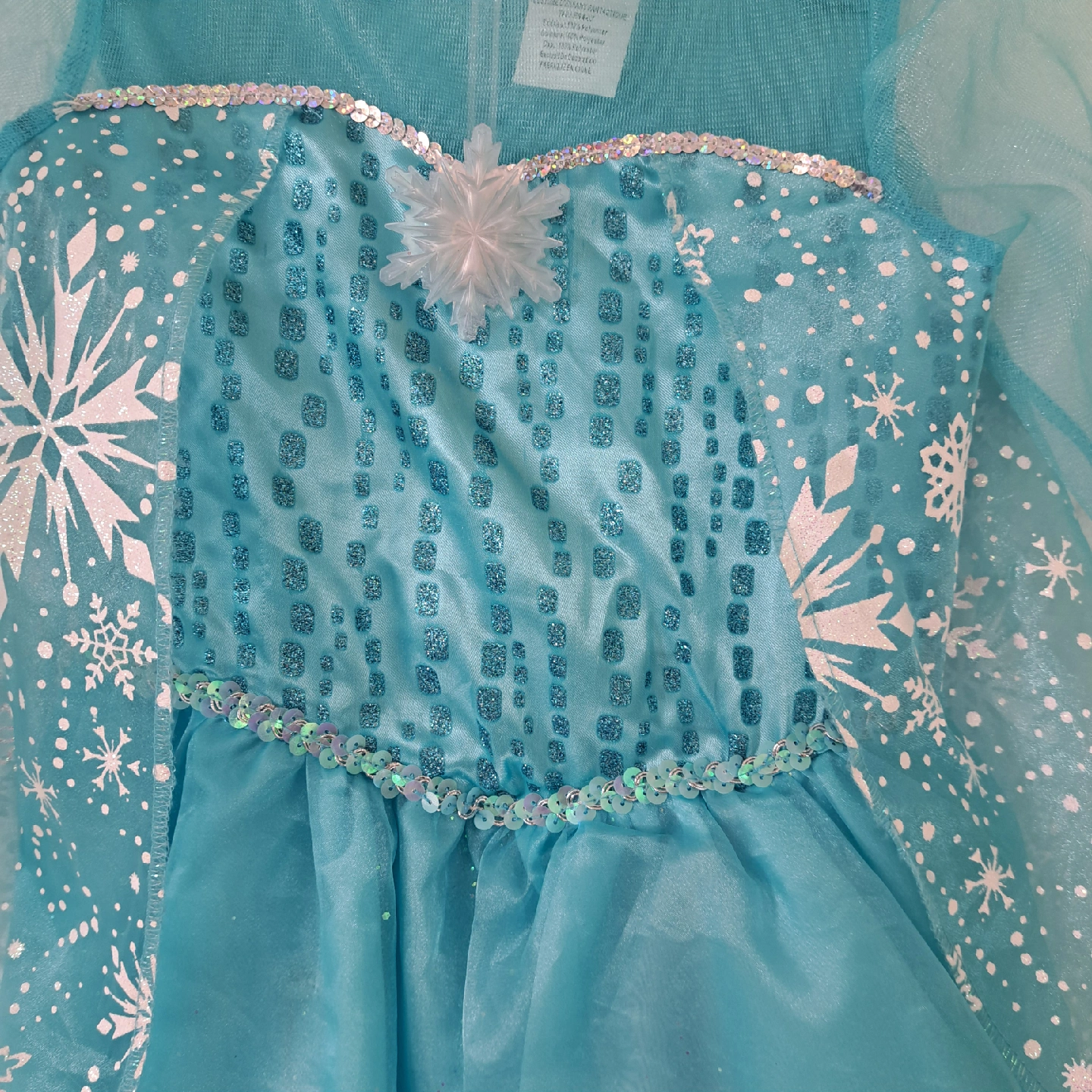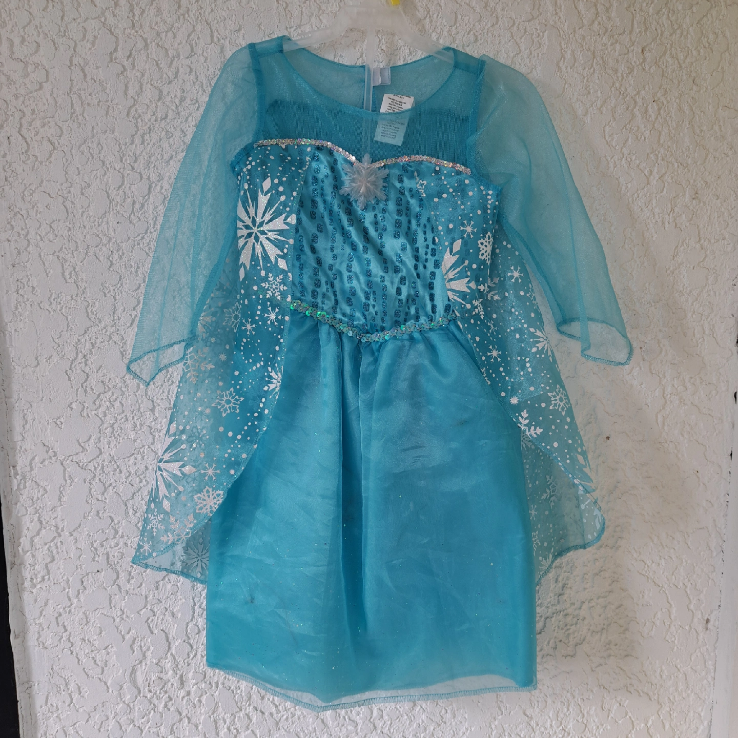 Elsa princess dress with Cape in back excellent condition, never worn (just minor defect with the Velcro backing a bit loose) sparkley snowflake pattern pattern battery pack inside dress lights up the skirt portion of the dressnwoth twinkle lights Size would range from 3T to 5T (or possibly 6T for a very small 6 yo) check out my other listing for costumes and other kids items (shoes, coats, toys etc.) open to reasonable offers! pet-free smoke-free bug-free home