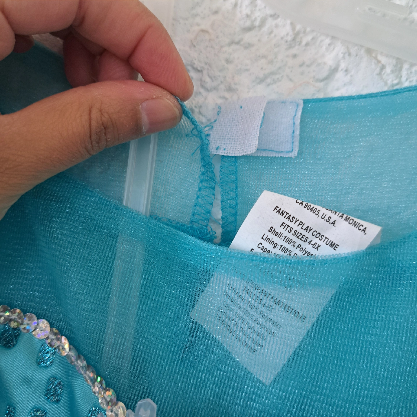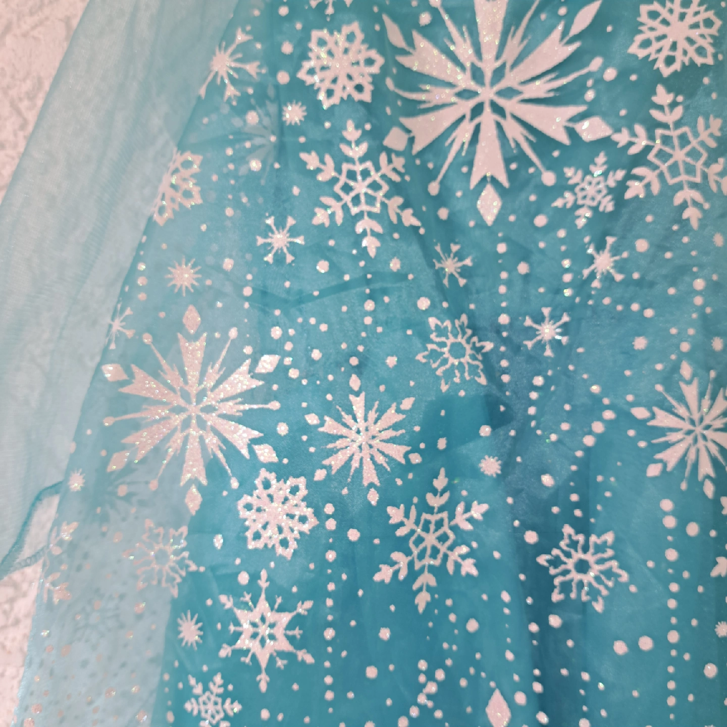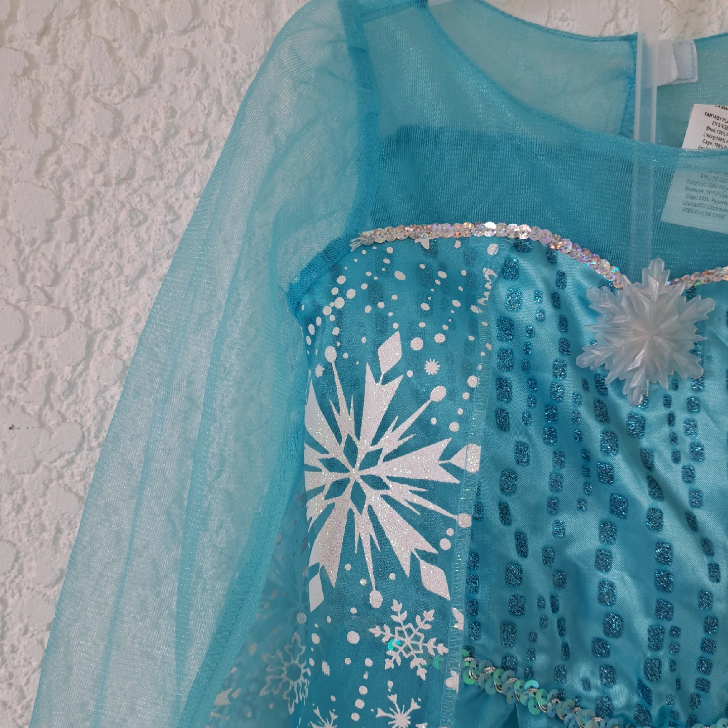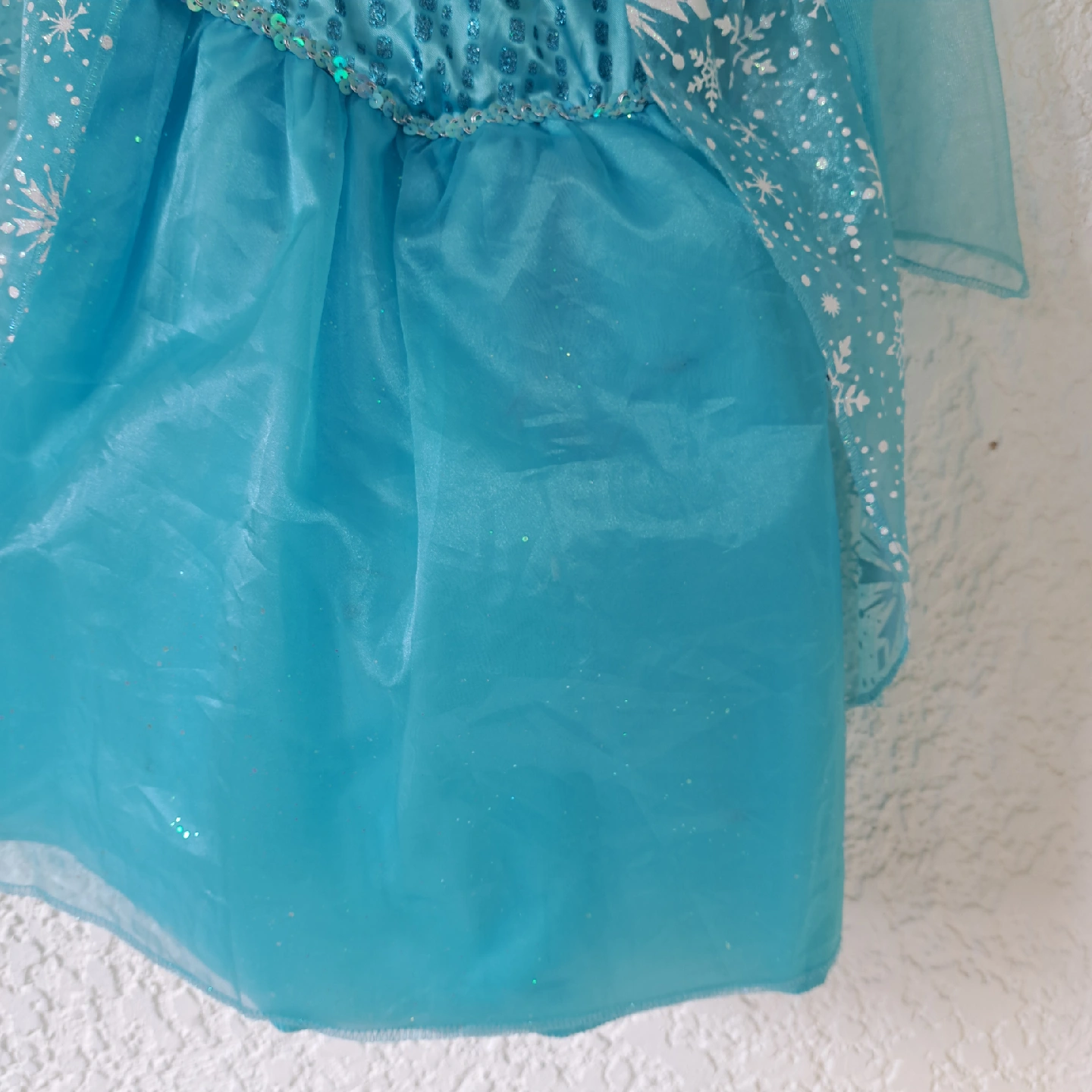 Elsa princess dress with Cape in back excellent condition, never worn (just minor defect with the Velcro backing a bit loose) sparkley snowflake pattern pattern battery pack inside dress lights up the skirt portion of the dressnwoth twinkle lights Size would range from 3T to 5T (or possibly 6T for a very small 6 yo) check out my other listing for costumes and other kids items (shoes, coats, toys etc.) open to reasonable offers! pet-free smoke-free bug-free home
