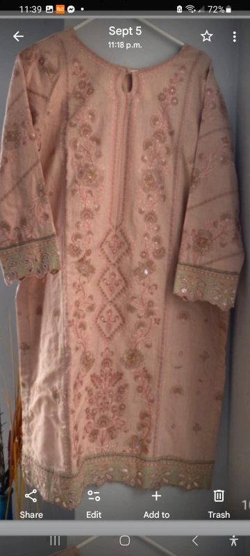 Selling a beautiful embroidered kurti top. The colour is a light peach or blush, and it features intricate embroidery throughout. It's in great condition and would be perfect for a special occasion or everyday wear. Size is not indicated.