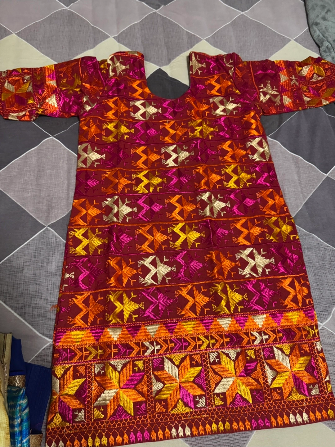 Beautifully embroidered Phulkari suit with vibrant colours and intricate designs! Perfect for special occasions or adding a touch of cultural flair to your wardrobe