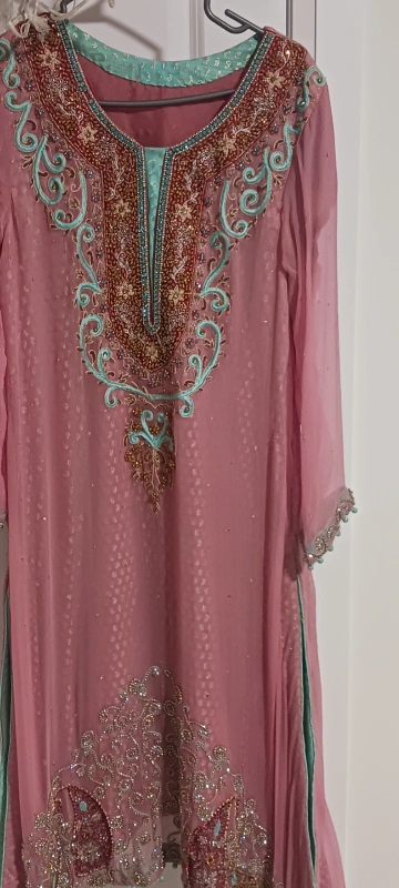 Beautiful pink salwar kameez with intricate embroidery and beadwork. It's in great condition and ready for a new home. Perfect for special occasions or adding a touch of elegance to your wardrobe!