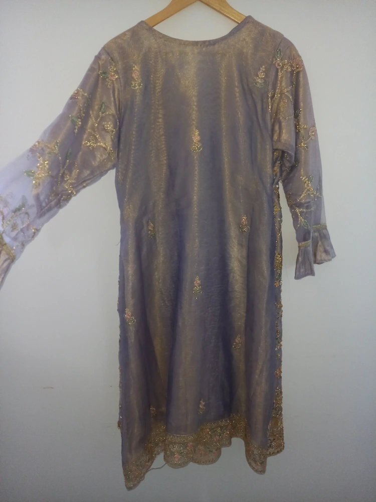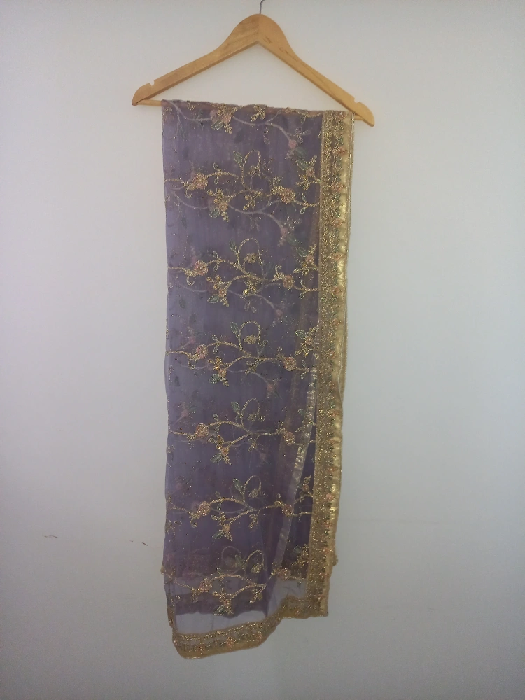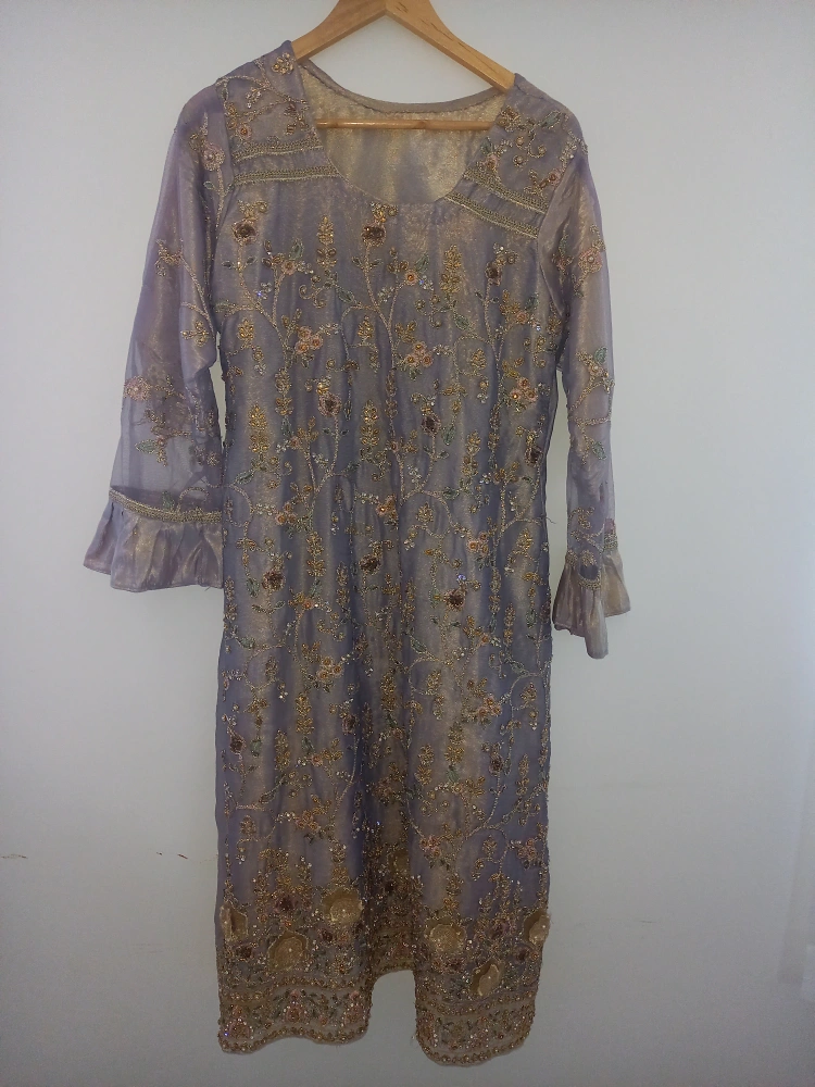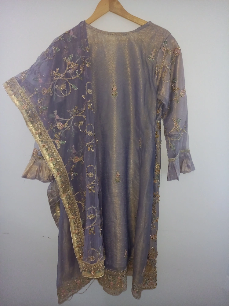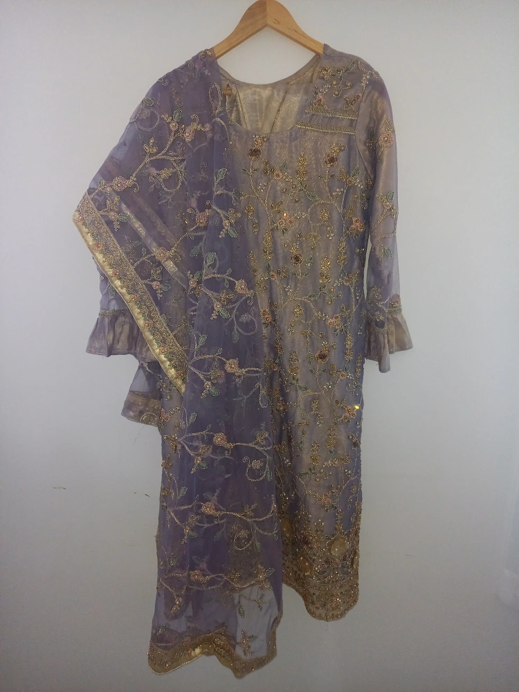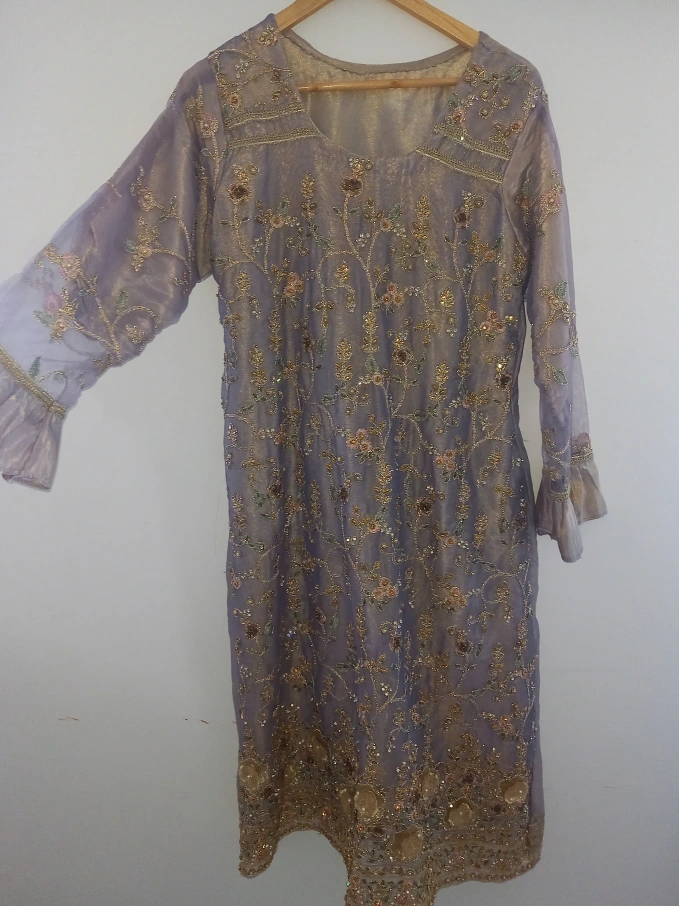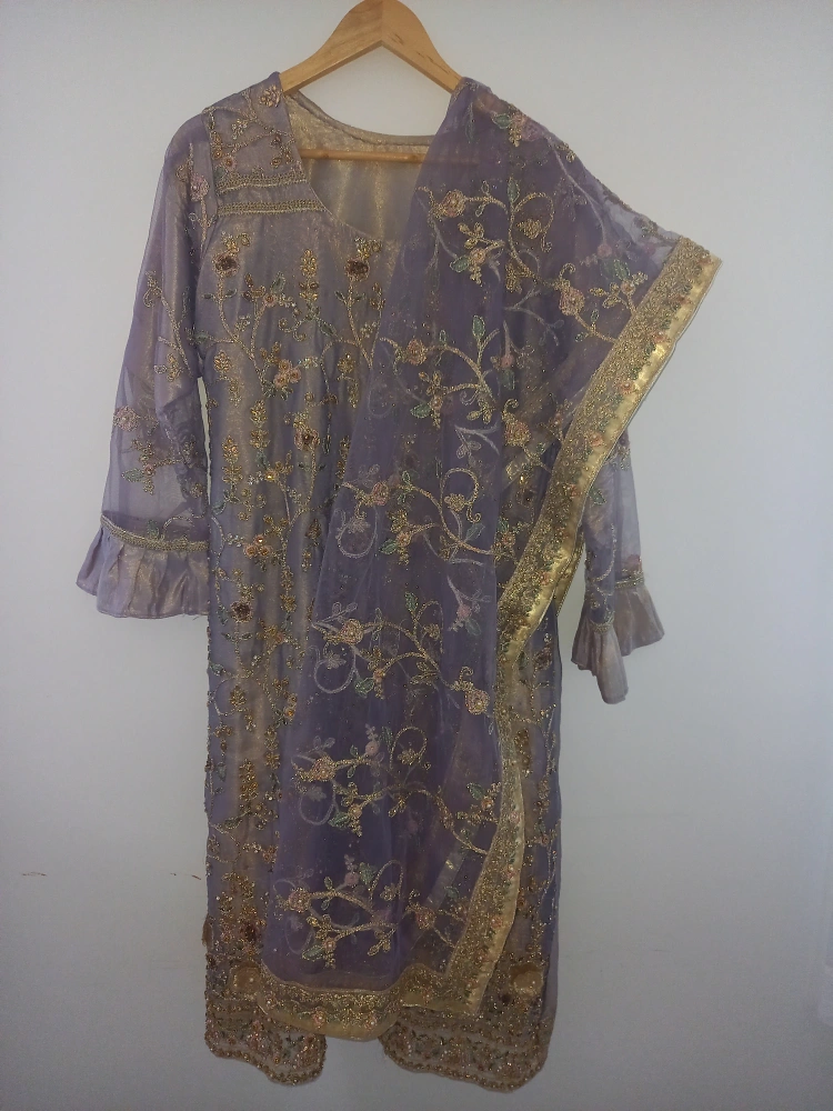 Beautiful salwar kameez suit with intricate embroidery and a matching dupatta. The fabric has a lovely sheen and the embellishments add a touch of elegance. Perfect for special occasions or festive events.