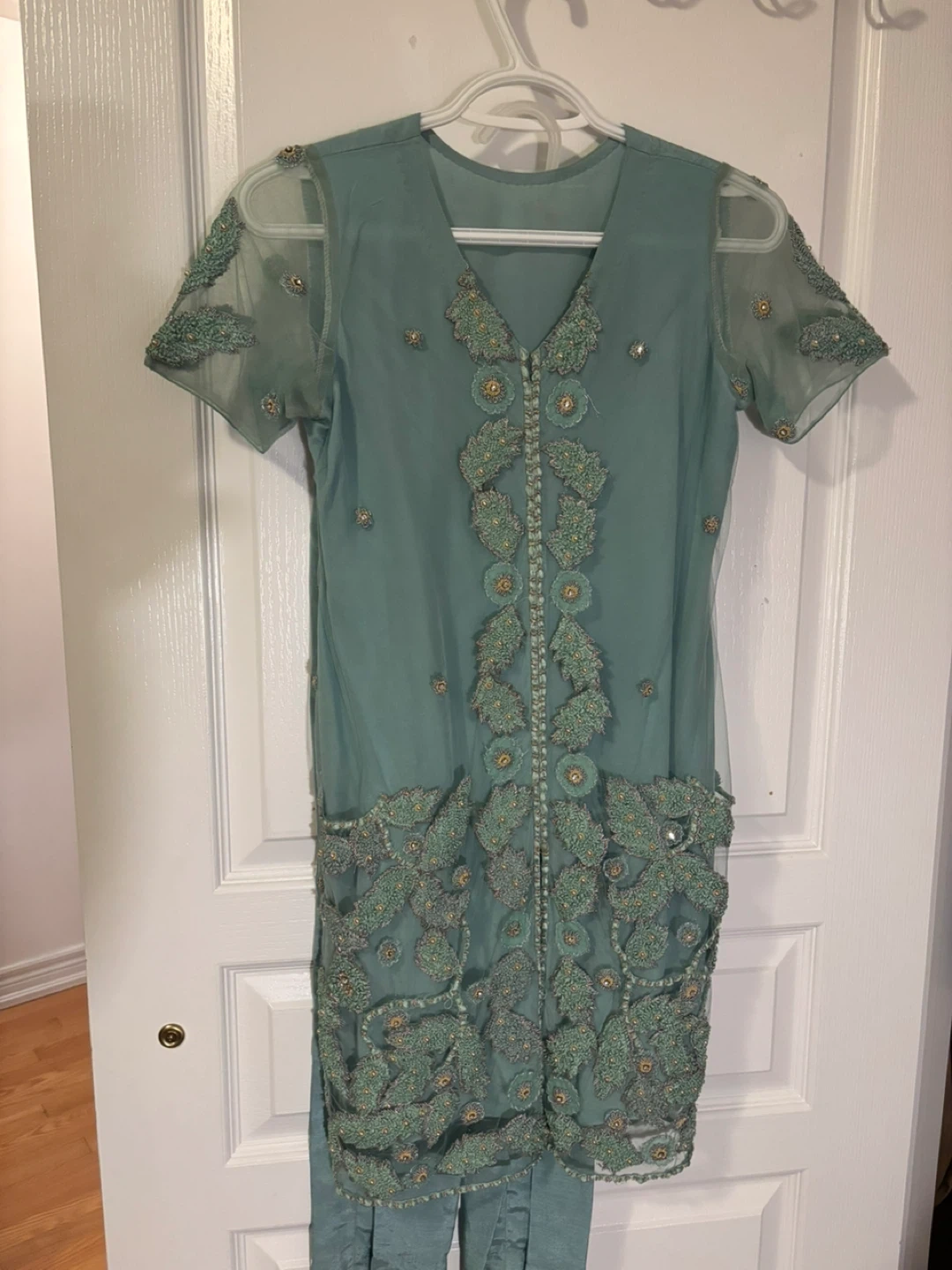 Selling a beautiful salwar kameez, perfect for special occasions! It features intricate embroidery and a unique design. The colour is a soft, calming teal. It's in great condition and ready for a new home!