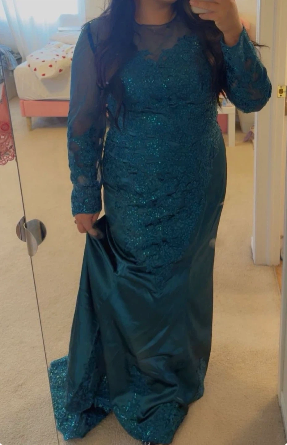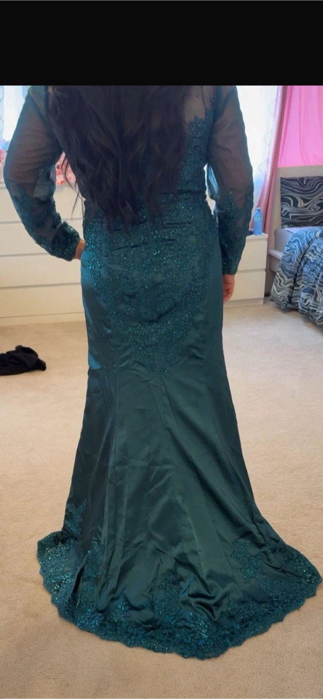 Beautiful emerald green formal dress, perfect for a special occasion! The dress features long sleeves, delicate lace detailing, and a flattering silhouette. It's in great condition and ready to make someone feel fabulous!