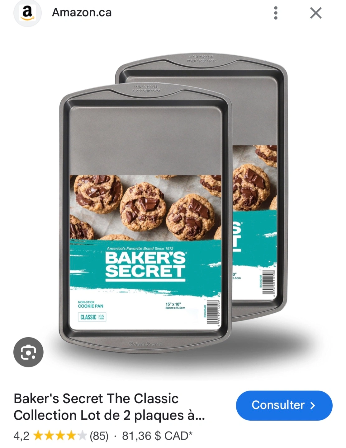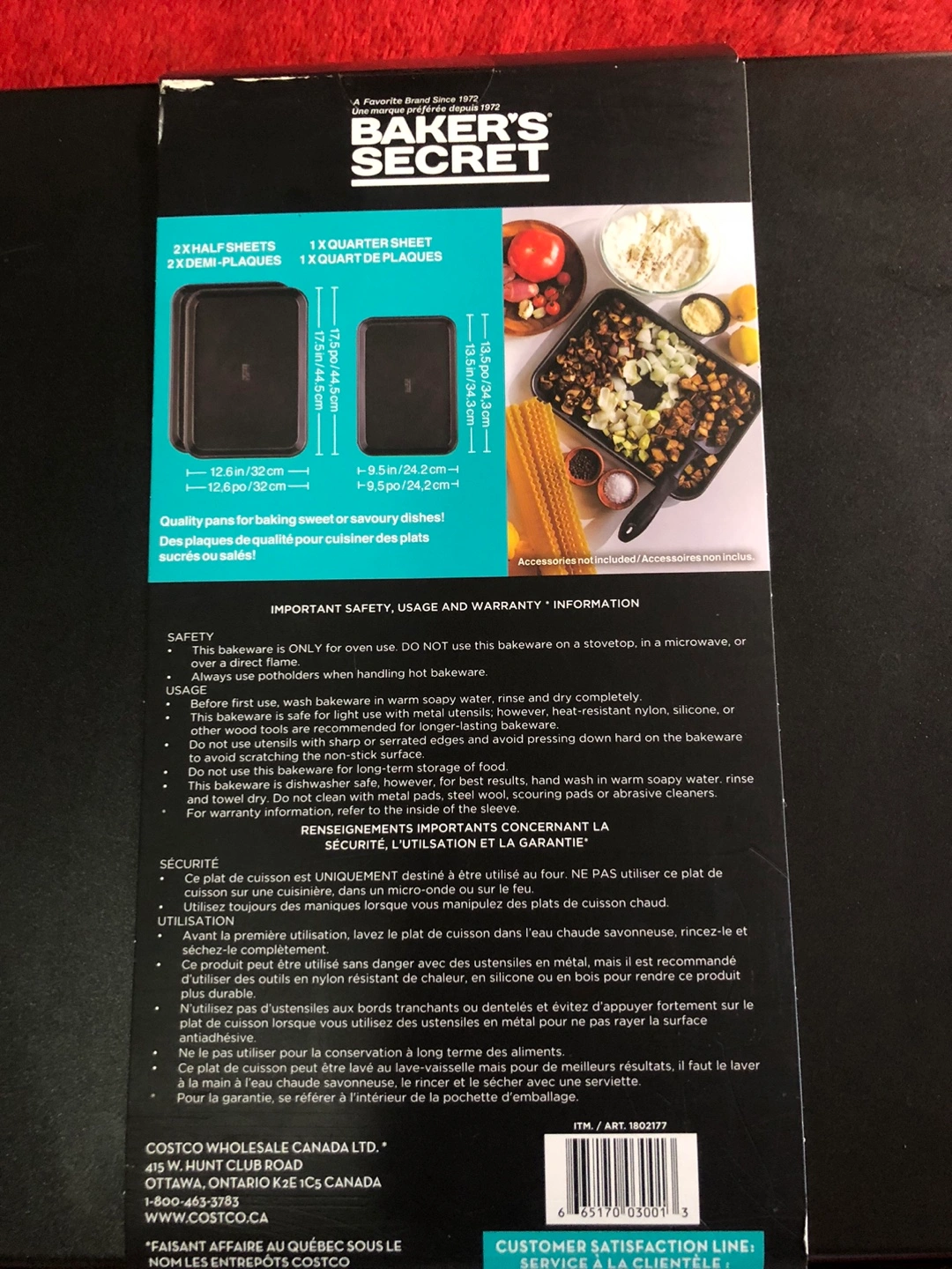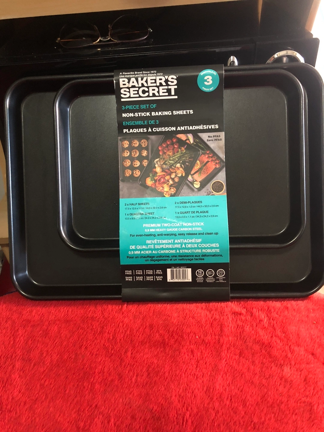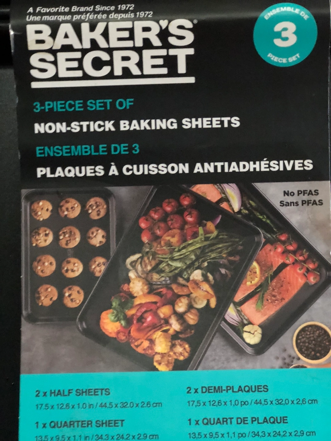 Je vends un ensemble de 3 plaques à cuisson antiadhésives de Baker's Secret. L'ensemble comprend : - 2 demi-plaques (17,5 x 12,6 x 1,0 po / 44,5 x 32,0 x 2,6 cm) - 1 quart de plaque (13,5 x 9,5 x 1,1 po / 34,3 x 24,2 x 2,9 cm) Elles sont parfaites pour la cuisson de vos gâteaux et biscuits préférés! Le revêtement antiadhésif de qualité supérieure assure un démoulage facile et un nettoyage aisé