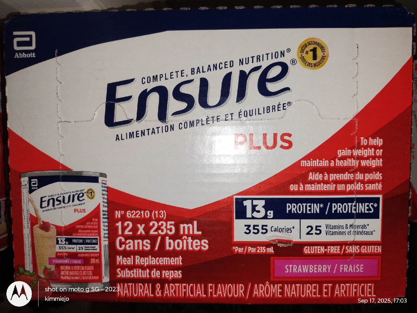 Ensure Plus// Strawberry & Vanilla 12 cans per case// each case contains 235 mL. Expiry; Vanilla//2025- December Expiry; Strawberry///2026- July