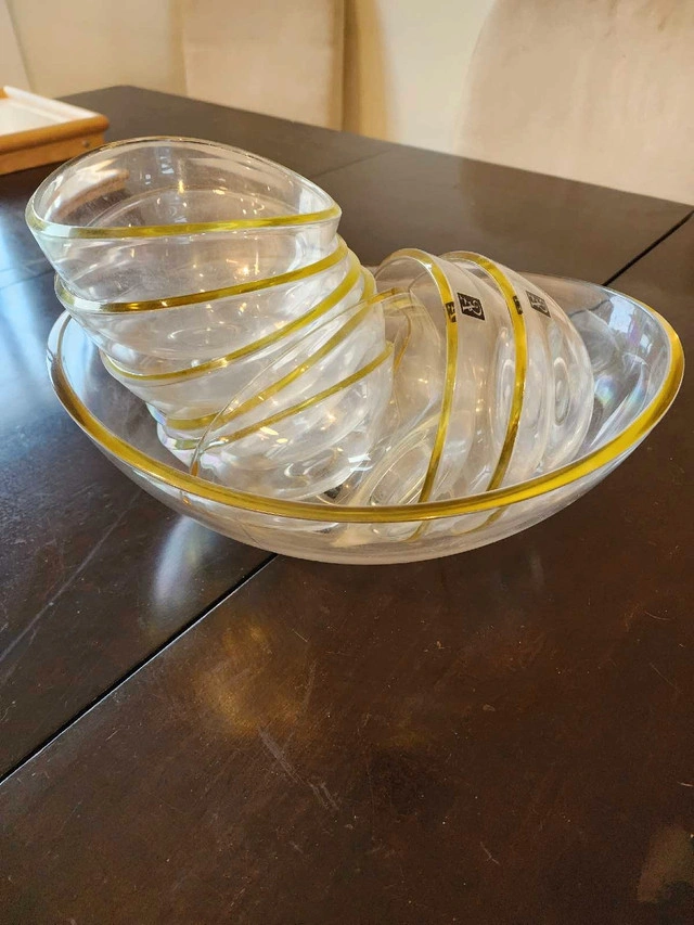 Elevate your dining experience with this elegant set of eight Epicure small salad bowls equipped with a serving bowl and salad tongs. These used bowls are great for those outside summer parties or to complement any table setting, perfect for salads, desserts, or side dishes. In good condition, they're ready to impress your guests. Features: * Brand: Epicure * Quantity: Eight (8) bowls * Salad Tongs * Serving Bowl Looking at similar listings, a set of these bowls typically sells for around $30-$60. Given the set's good condition, I've priced it competitively. If the ad is up, the bowls are available – ready to add a sprinkle of class to your home!
