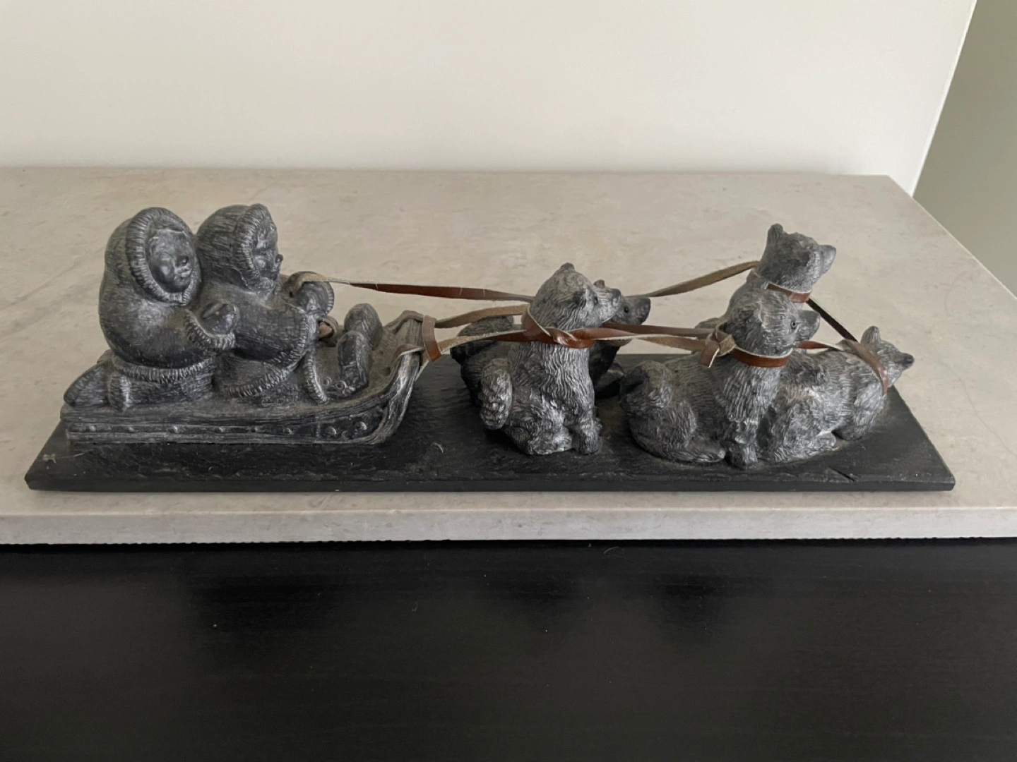 Unique soapstone carving. Depicts Inuit figures on a dog sled. Detailed carving.