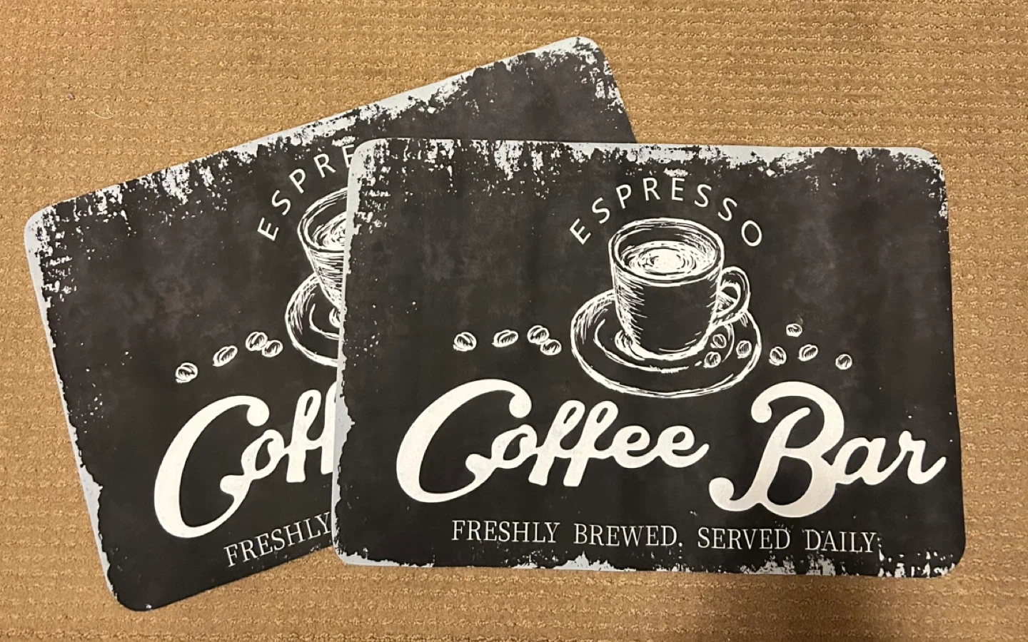 I'm selling a set of two mats with a coffee bar theme! They feature an espresso cup design and the words "Coffee Bar" printed on them. They're perfect for adding a touch of cafe style to your kitchen area.