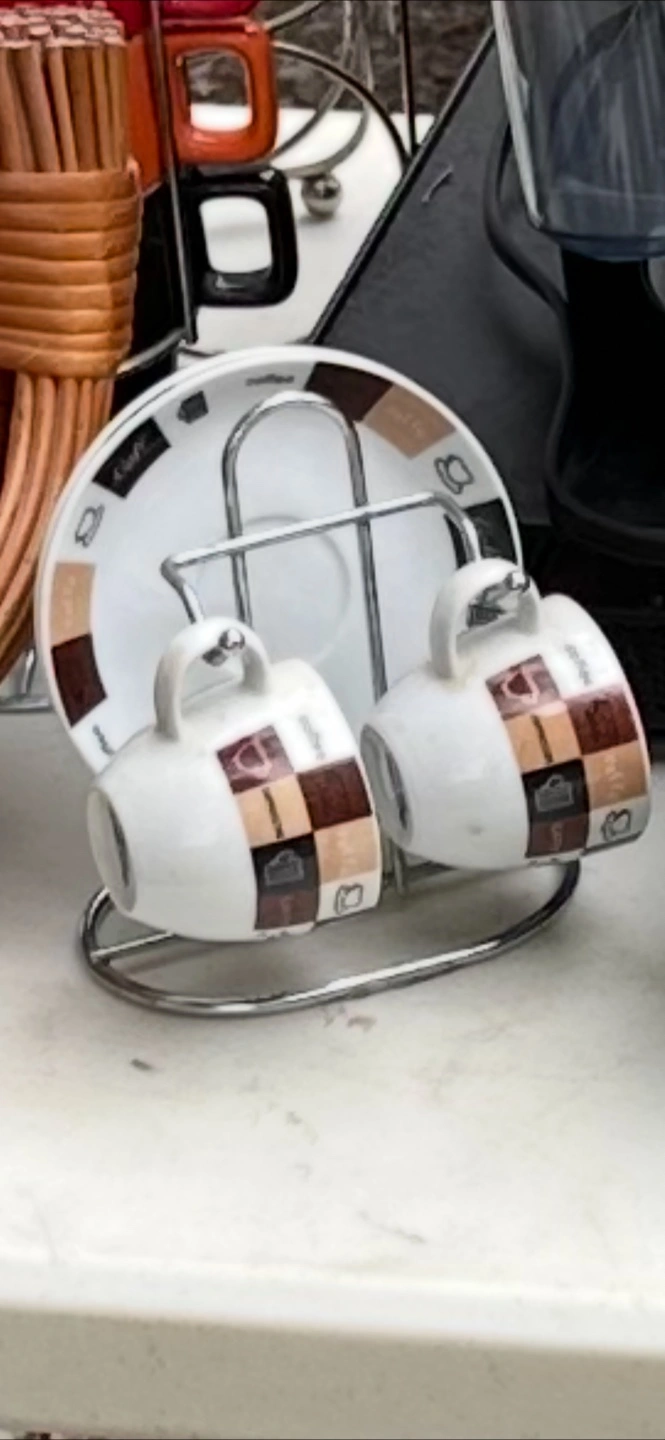 A lovely set of espresso cups, saucers and a metal stand. The cups have a checkered pattern of browns and beiges. Take a moment to enjoy a tiny bold shot in this beautiful set.