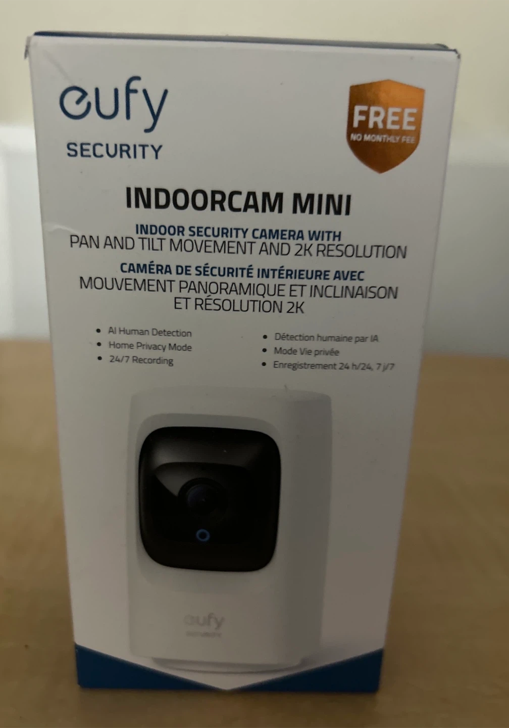 Selling a Eufy Security Indoor Cam Mini! It features pan and tilt movement with 2K resolution. It also has AI human detection, home privacy mode, and 24/7 recording. The camera also works with voice control and has 360° noise-activated pan. Included in the box are the IndoorCam, USB cable, adapter, mounting bracket, screws, and a quick start guide!