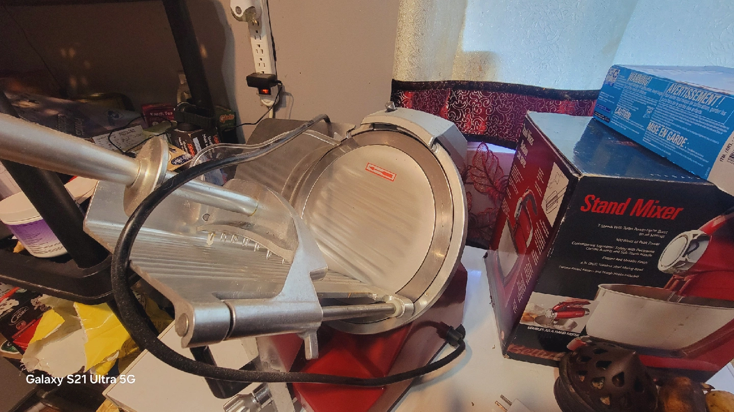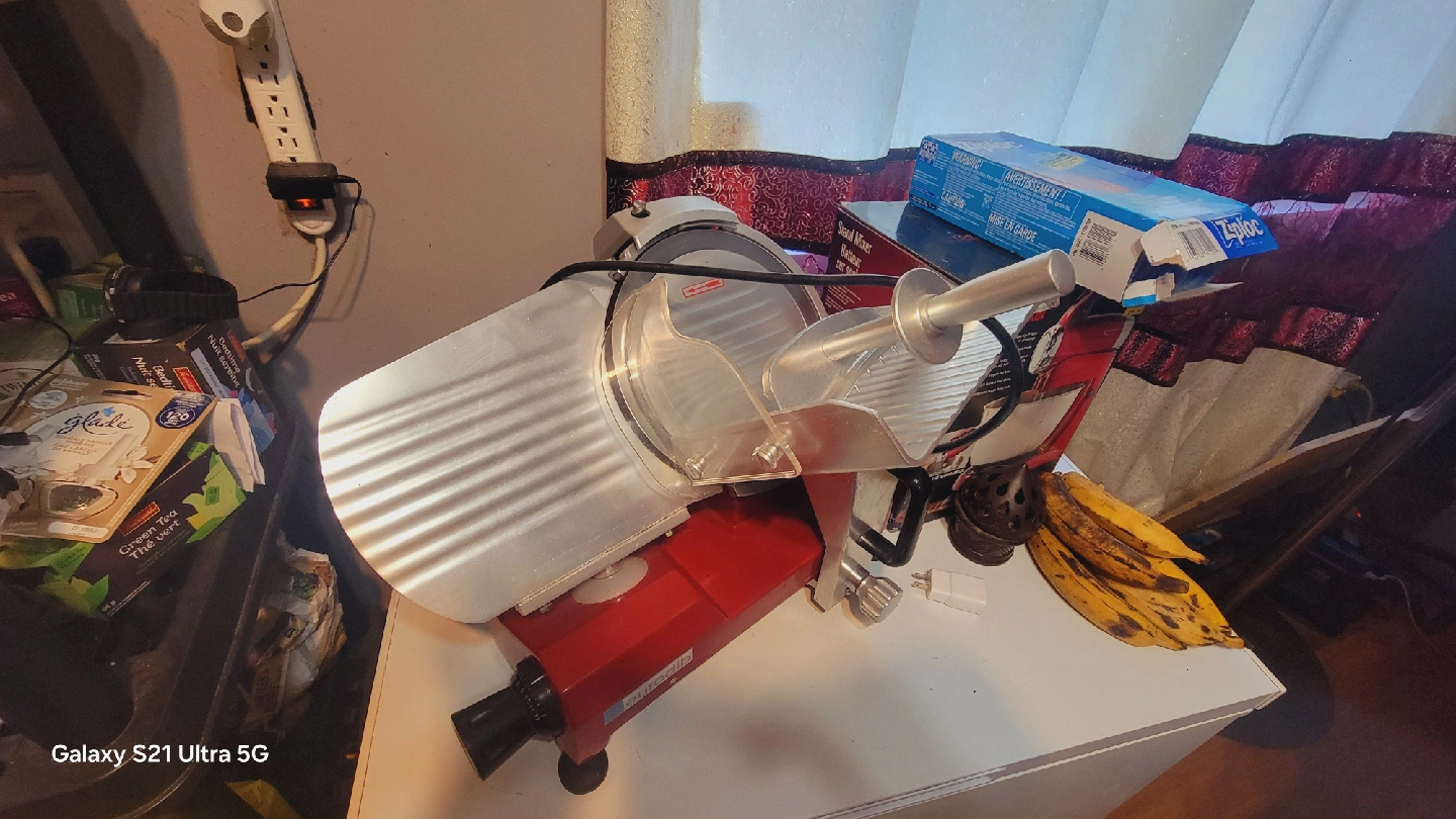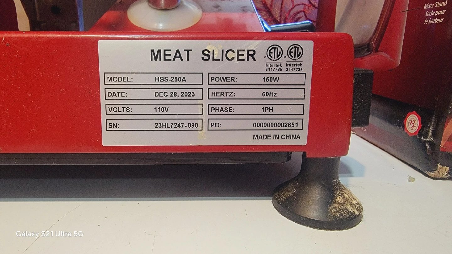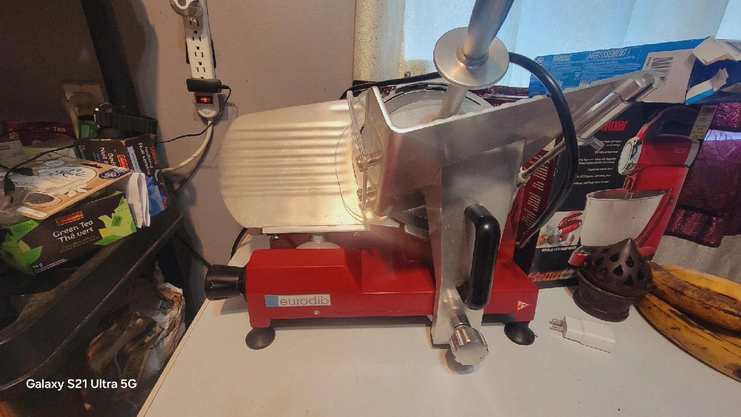 Eurodib Meat Slicer for sale! Model HBS-250A. It's in great working condition and ready to slice up your favourite meats and cheeses. It operates at 110V and 150W. Only used once. Blade is 10 inches