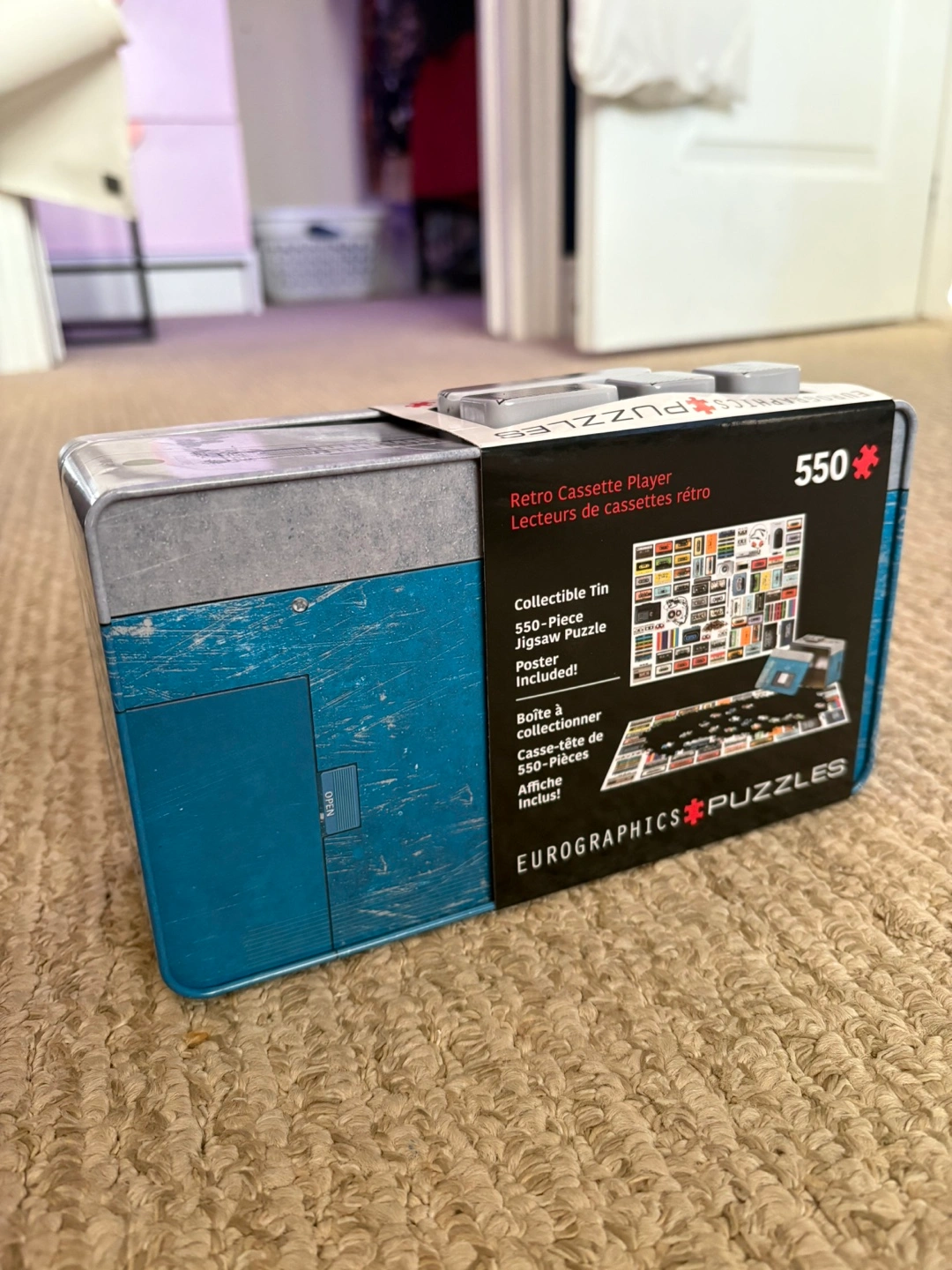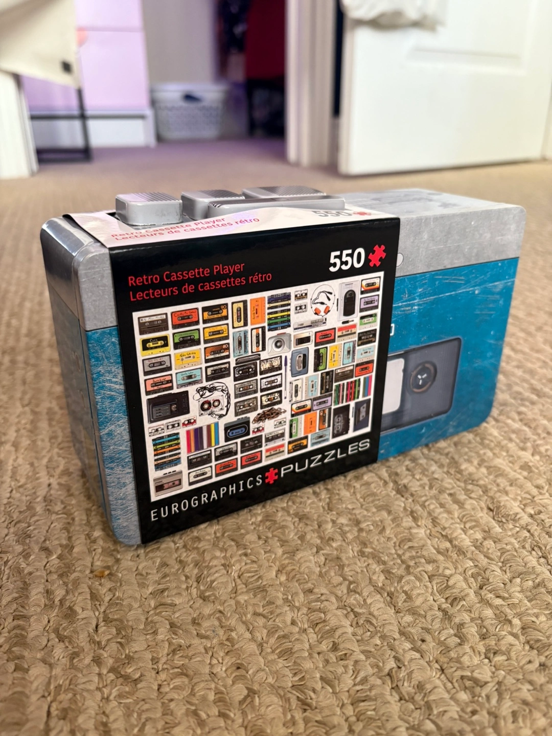 Looking to sell this Eurographics Retro Cassette Player 550-piece jigsaw puzzle. It comes in a collectible tin and includes a poster. Great for puzzle enthusiasts!