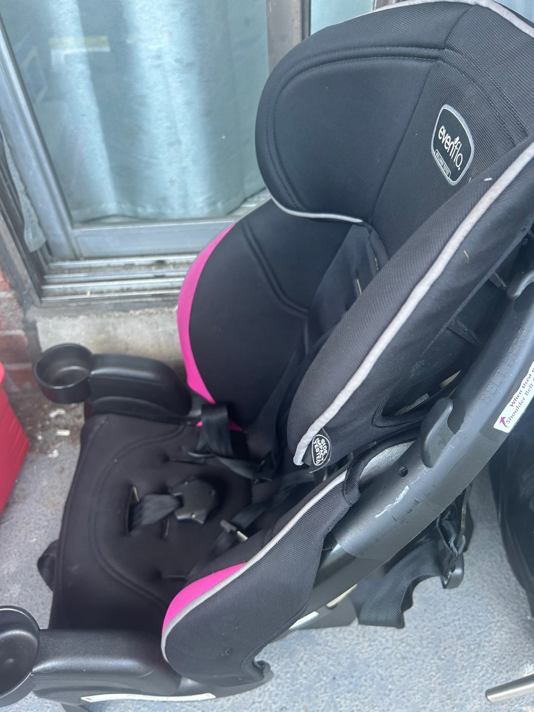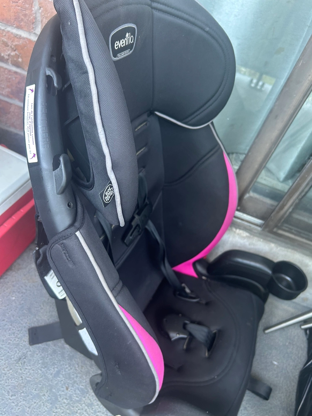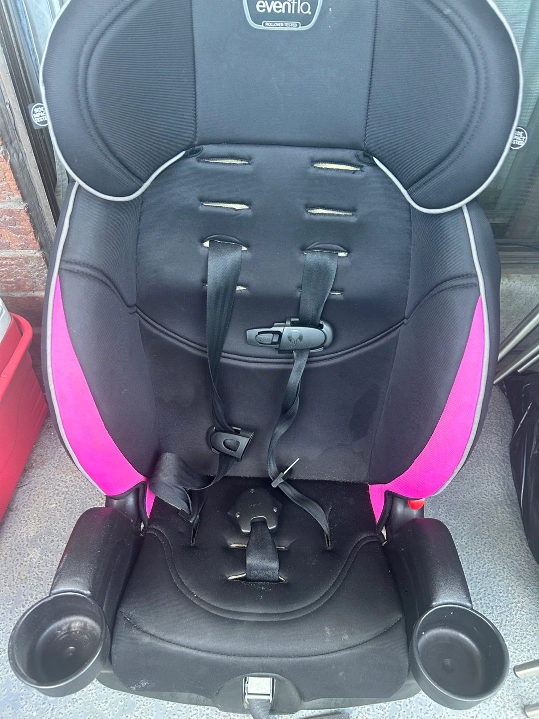 Used Evenflo car seat plus booster. Black and pink. Includes cup holders. Good used condition.