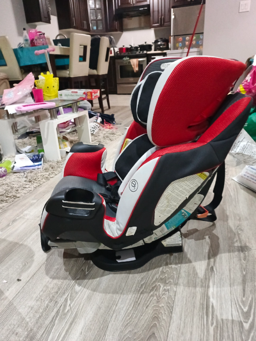 Selling a used Evenflo car seat in red, black, and grey. It's in good condition and ready for its next little passenger! Perfect for keeping your child safe and comfortable on the road