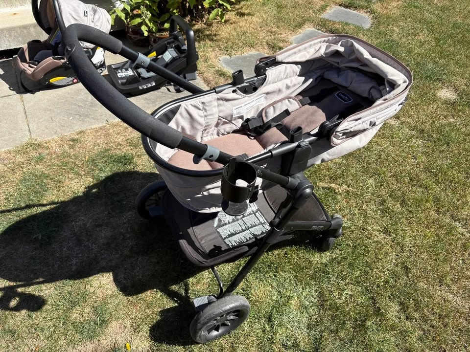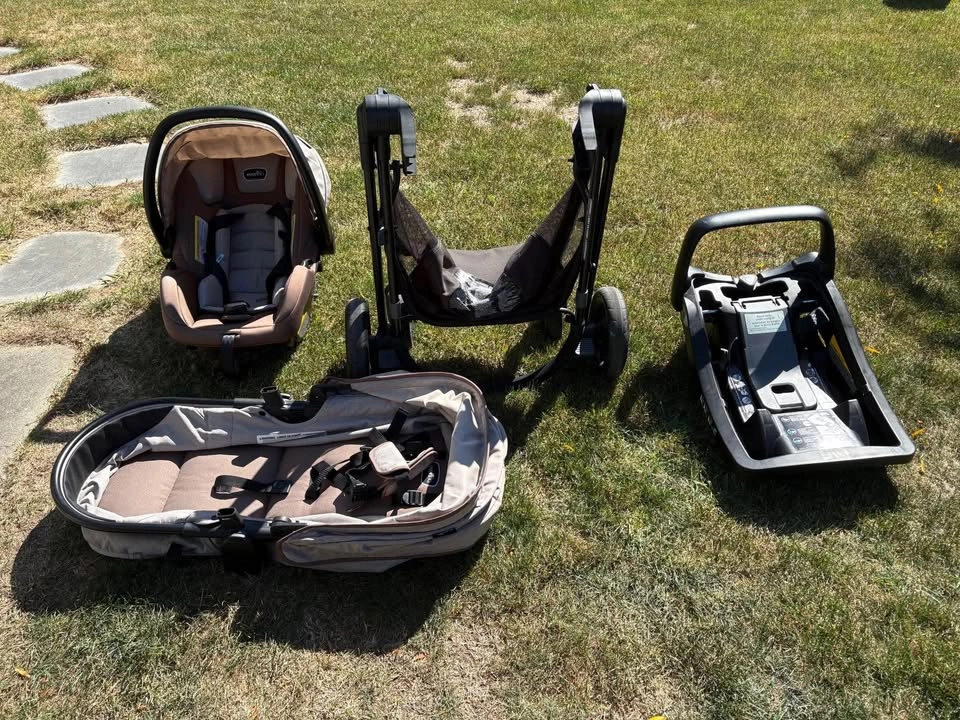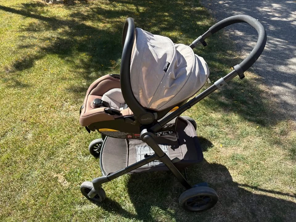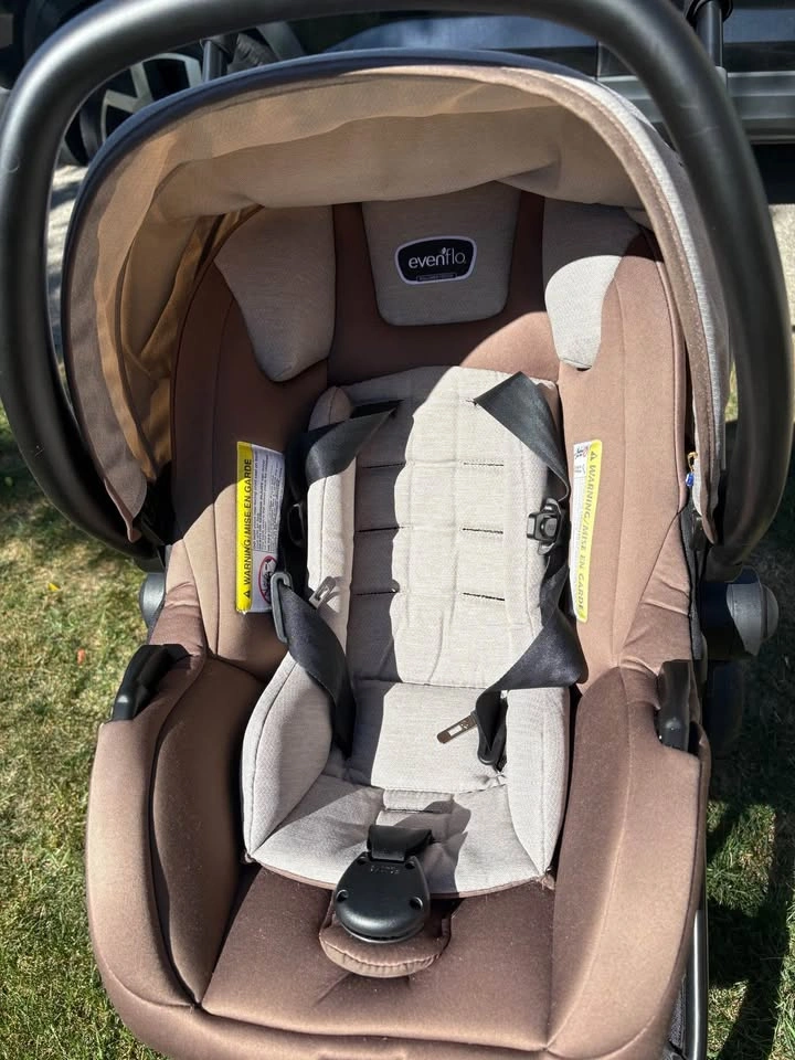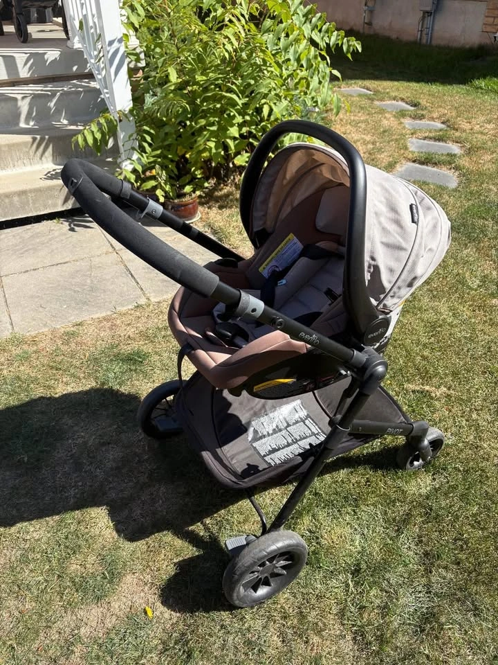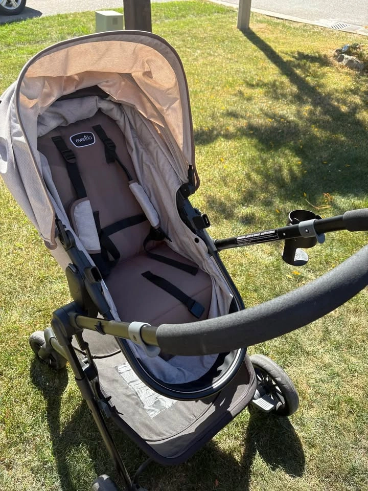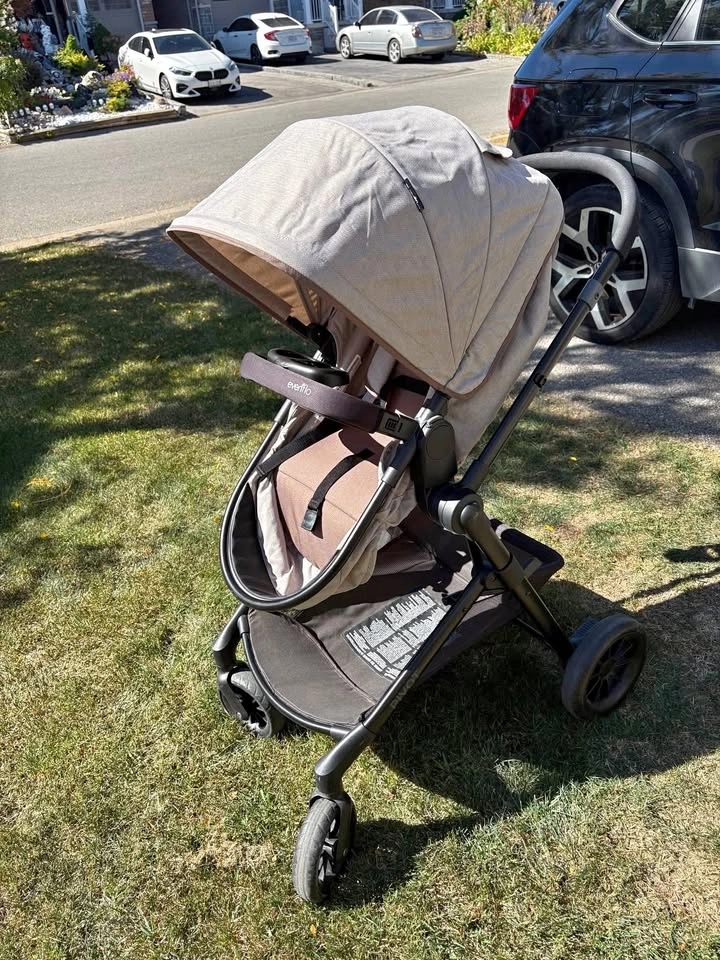 Selling my Evenflo Pivot Modular Travel System, purchased new in October 2024. It was only used for a couple of months as a spare stroller and is in excellent condition. The fabric is spotless and fresh, handlebars are clean with no rips or scuffs, and the only signs of use are a few light scuffs on the frame and wheels. This system includes everything you need from day one through toddlerhood: ✔️ Stroller frame ✔️ Toddler seat (reversible – forward or parent facing) ✔️ Evenflo SafeMax infant car seat ✔️ Car seat base (2024) lots of years left in it. Features: • Modular design: 6 modes of use – the seat easily converts from an infant car seat frame stroller, to a carriage, to a toddler seat (parent- or forward-facing). • Reversible stroller seat: Baby can face you or the world. • Infant car seat: SafeMax car seat clicks directly into stroller or base for easy transitions. • Lightweight & easy to fold: One-hand, self-standing fold makes storage and transport simple. • Large canopy with peek-a-boo window to keep baby shaded and visible. • Oversized storage basket for diaper bag, shopping, or essentials. • Cruiser tires & ergonomic handle for smooth rides and easy steering. • Adjustable 3-position recline for baby’s comfort. • 5-point harness for safety. Condition: • Fabric is very clean (no stains, rips, or fading). • Handlebars are in like-new condition (no peeling or damage). • A few minor scuffs on the frame from normal use. Why you’ll love it: This travel system is perfect for parents who want a versatile, stylish, and reliable stroller that grows with your child. It’s easy to maneuver, simple to fold, and safe for newborn through toddler stages.