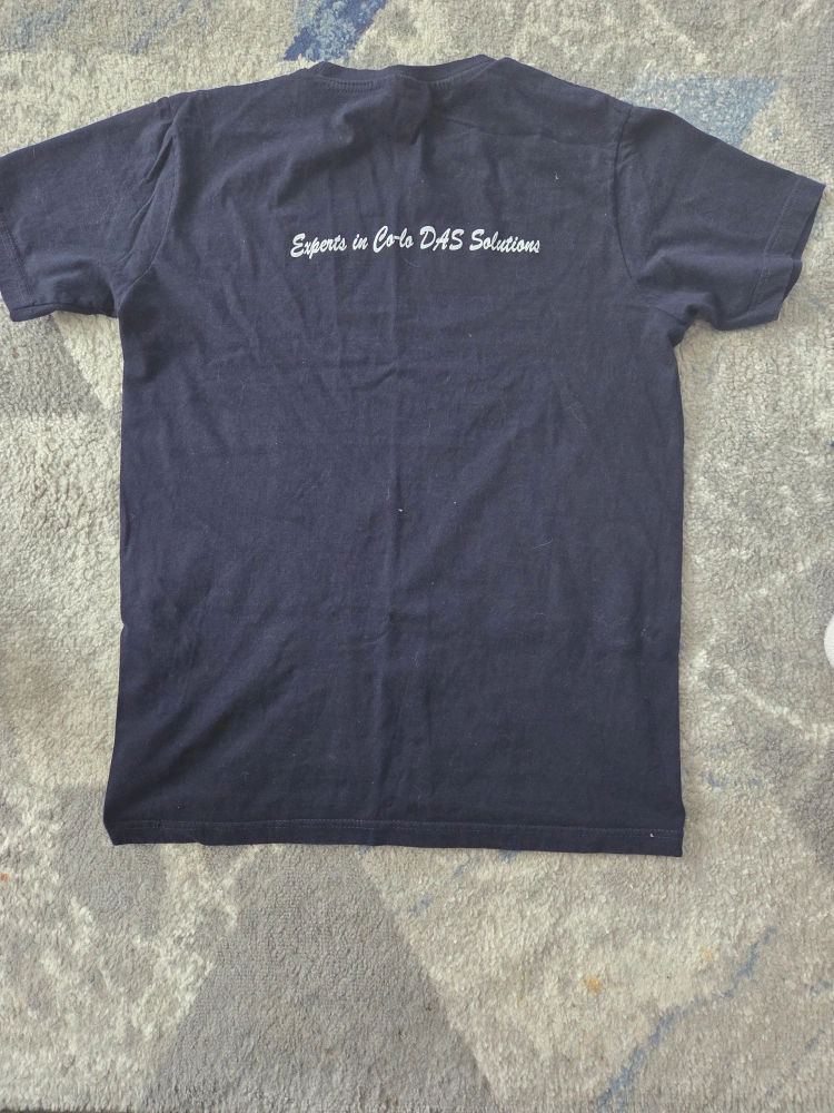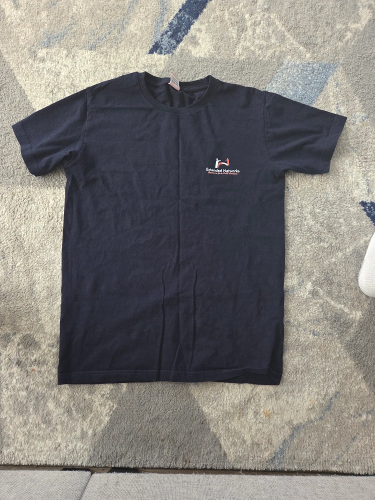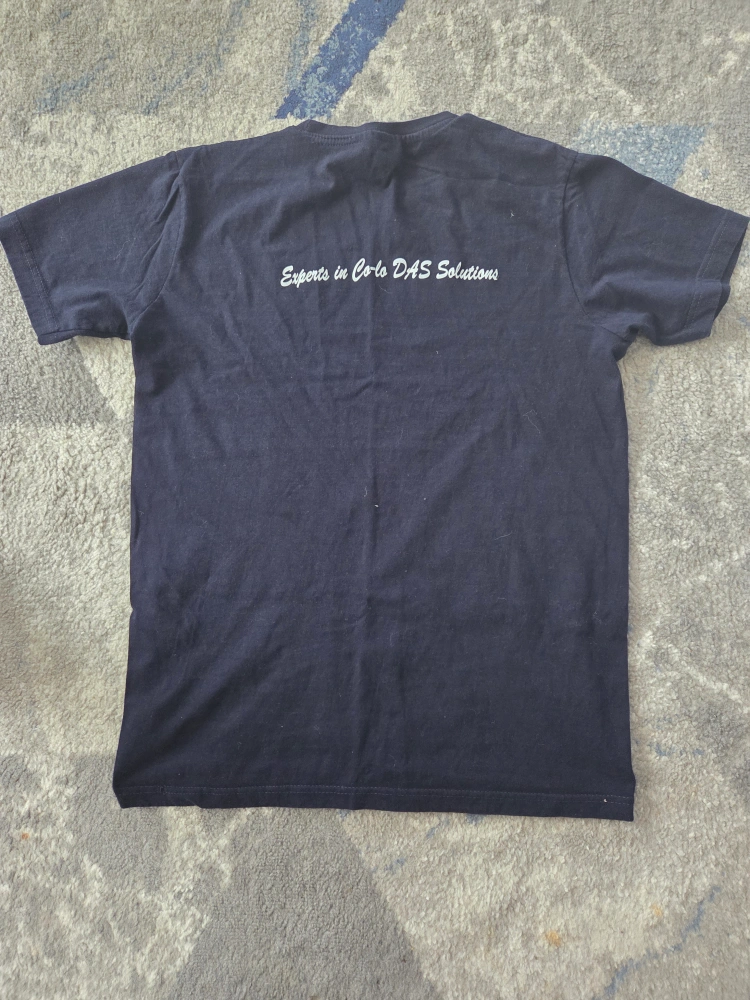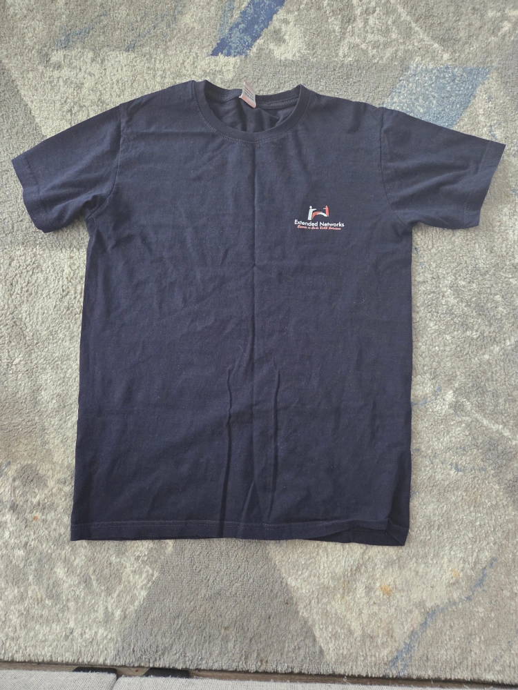 Selling a black t-shirt from Extended Networks. The shirt has the company logo on the front and says 'Experts in Co-Lo DAS Solutions' on the back
