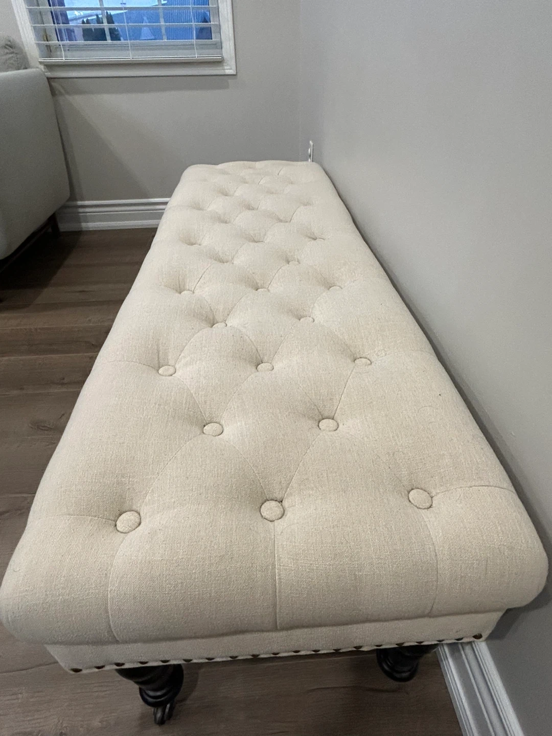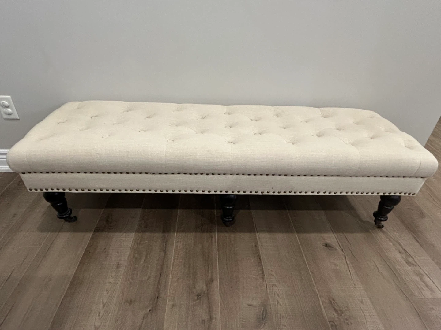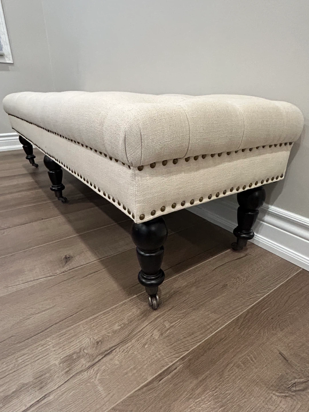Selling a lovely 5 feet long upholstered bench. It features a tufted design and elegant black legs with wheels. Perfect for adding a touch of sophistication to any room. The bench is in great condition.