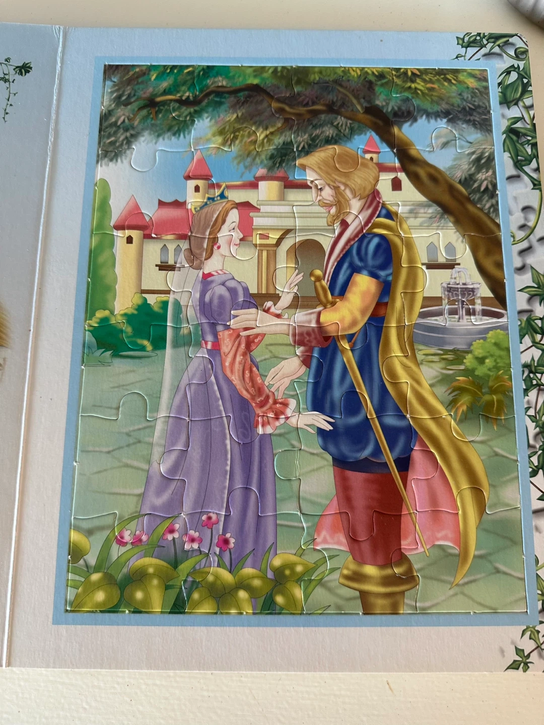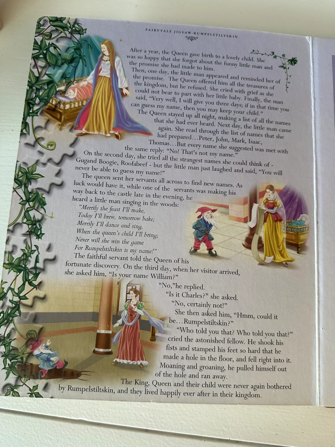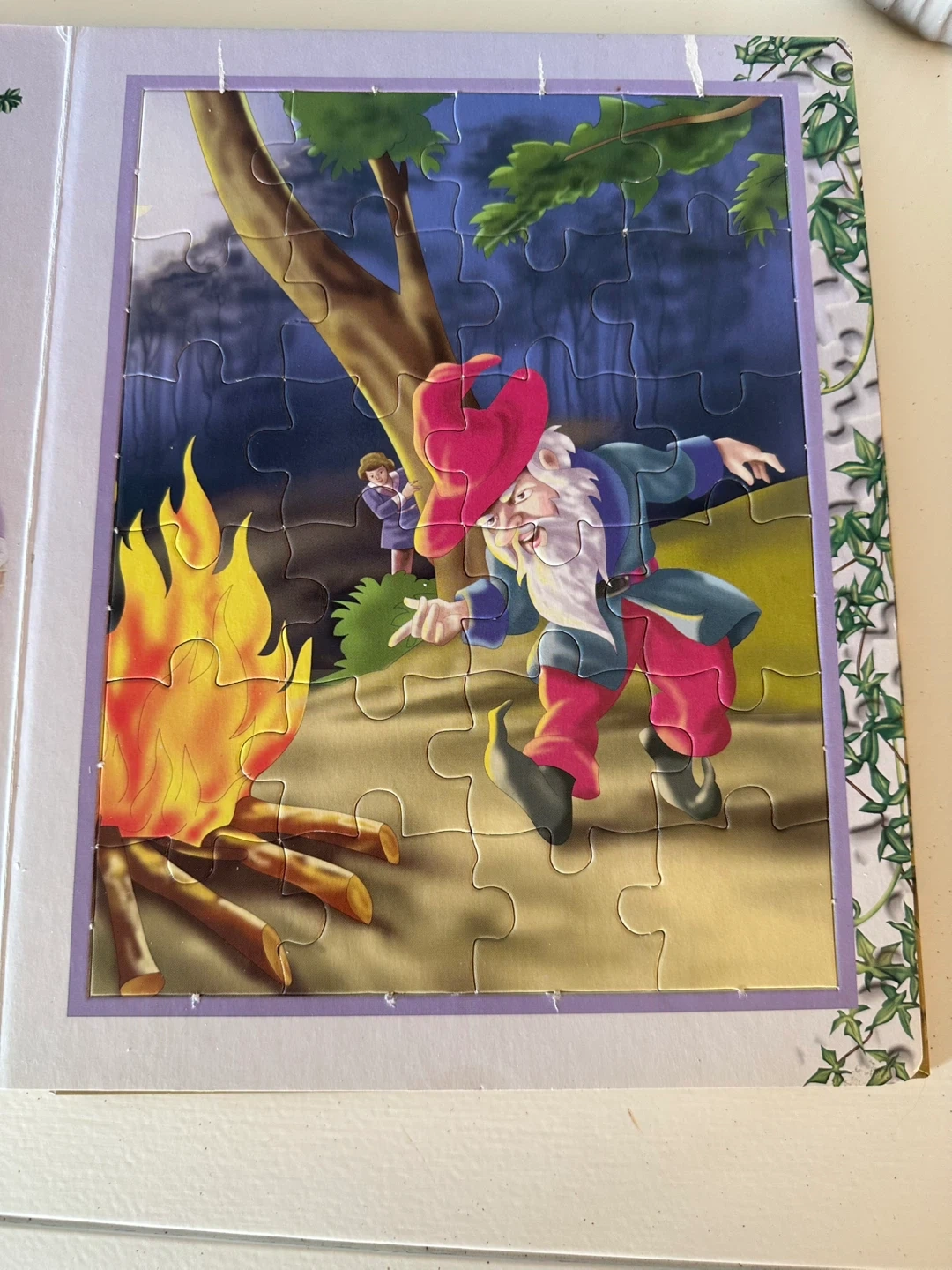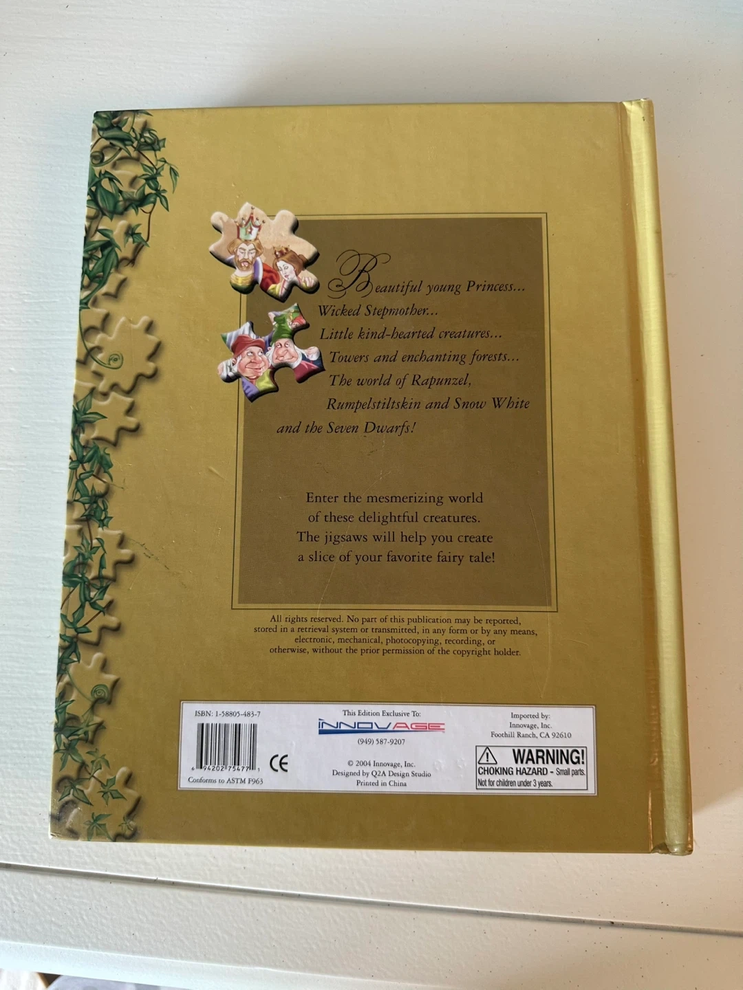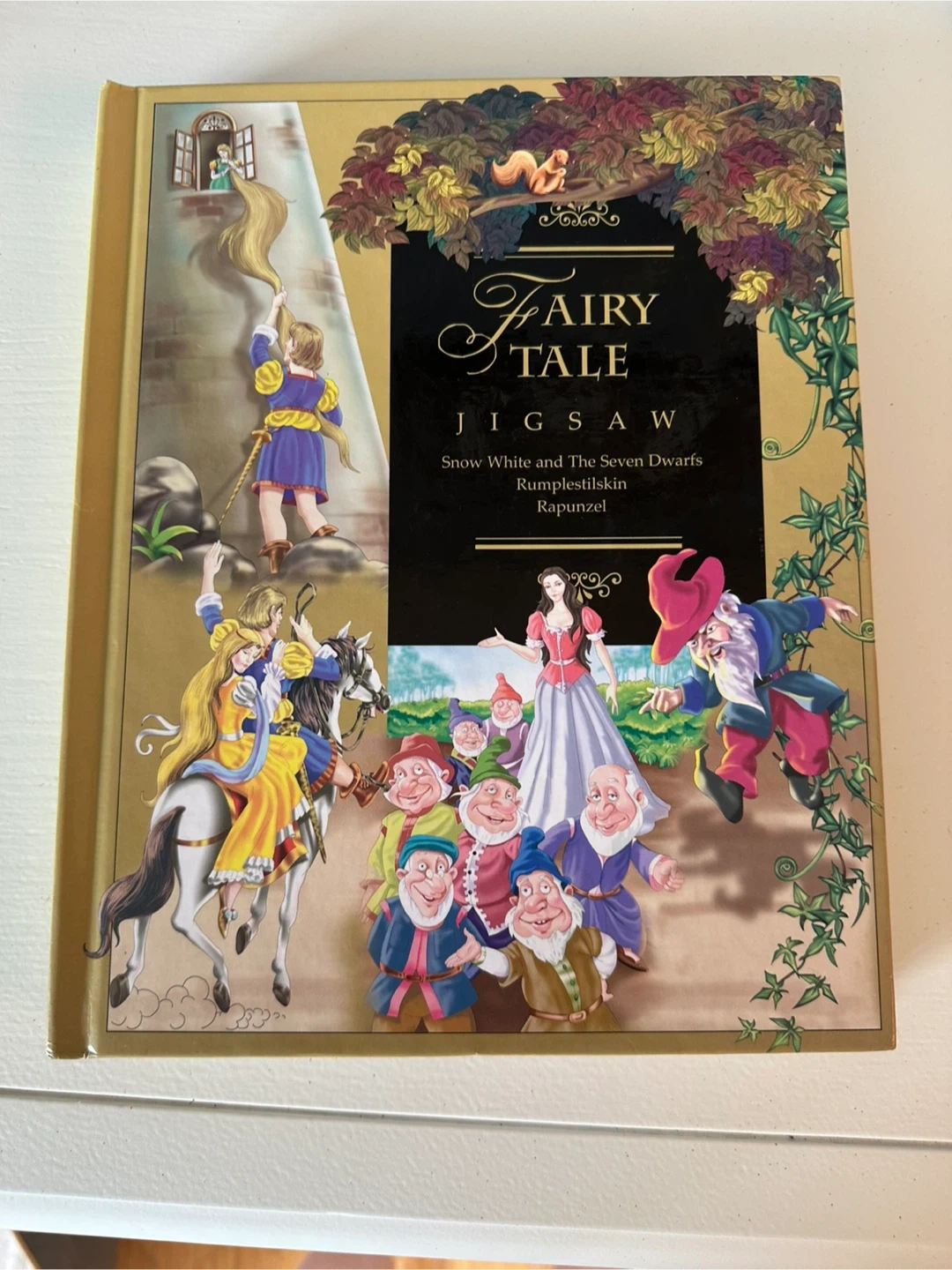Fairy Tale Jigsaw book It contains six fairy tale puzzles, with each page serving as a puzzle. It is a hardcover book with heavy board pages. This specific edition is known as "Fairy Tale Jigsaw: Snow White and the Seven Dwarfs, Rumplestilskin, Rapunzel". Pick up Windsor Park