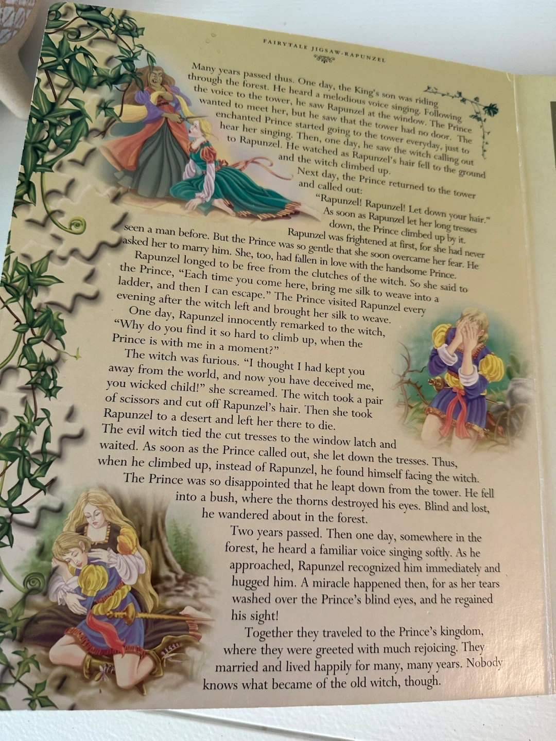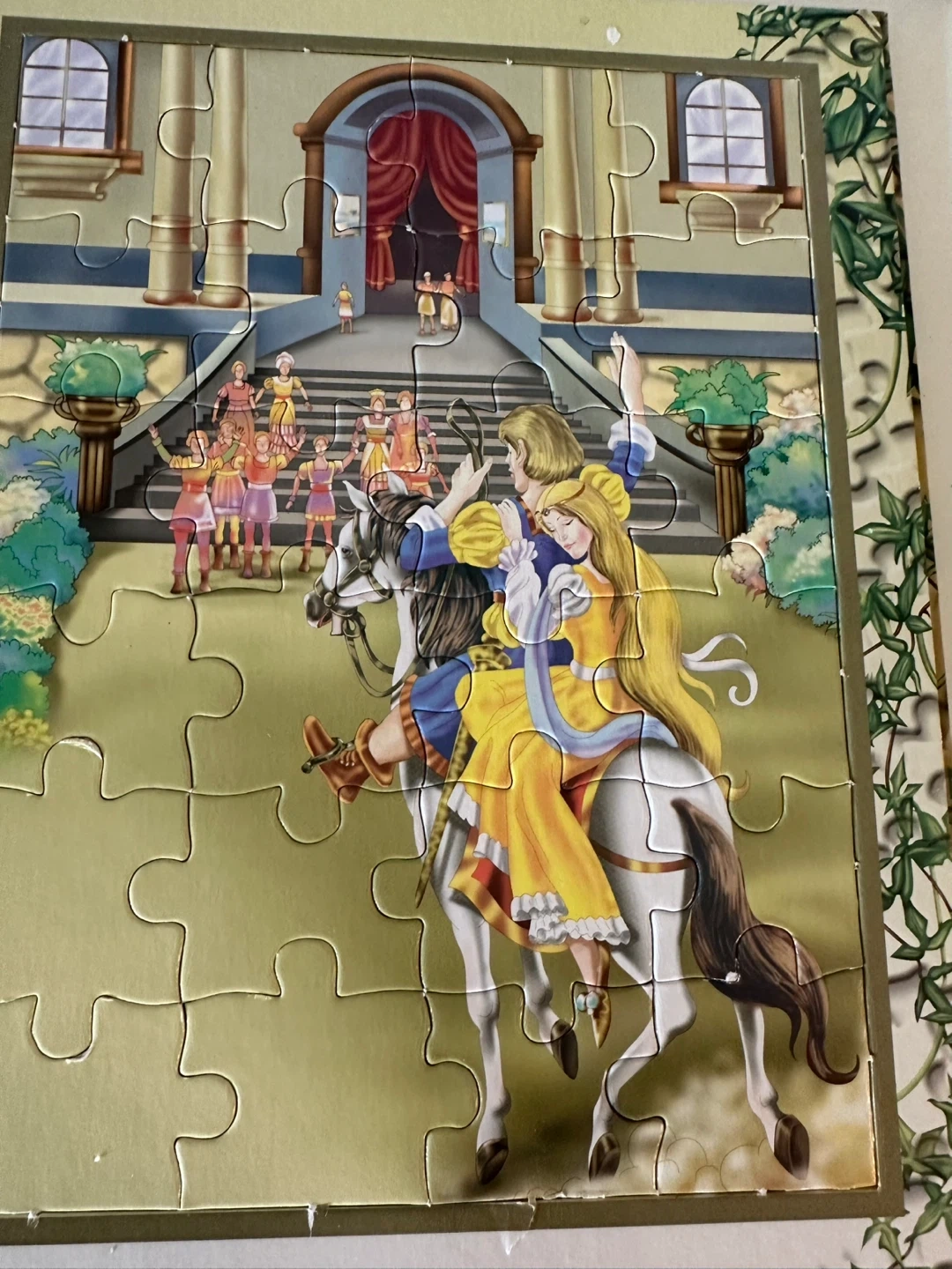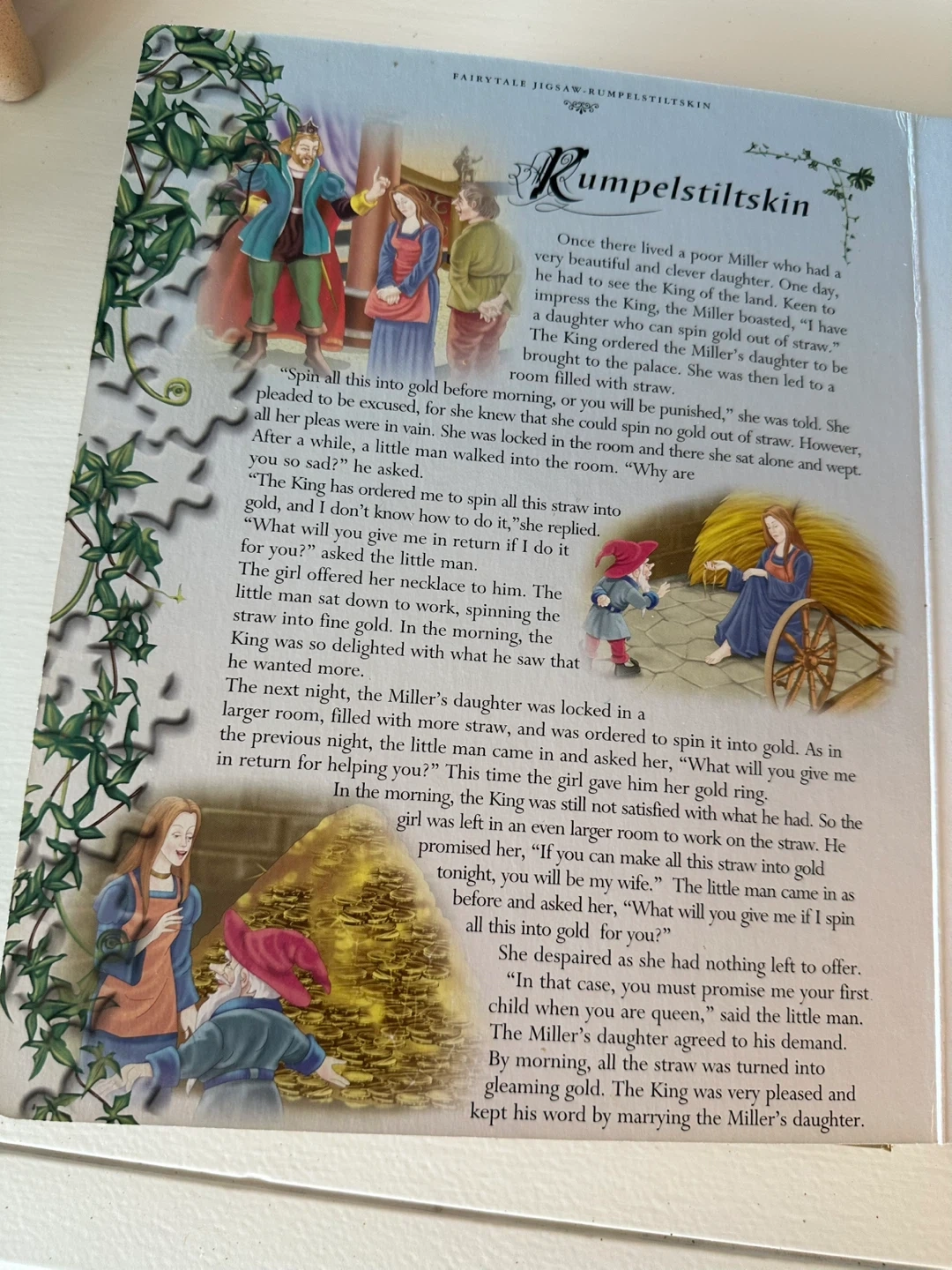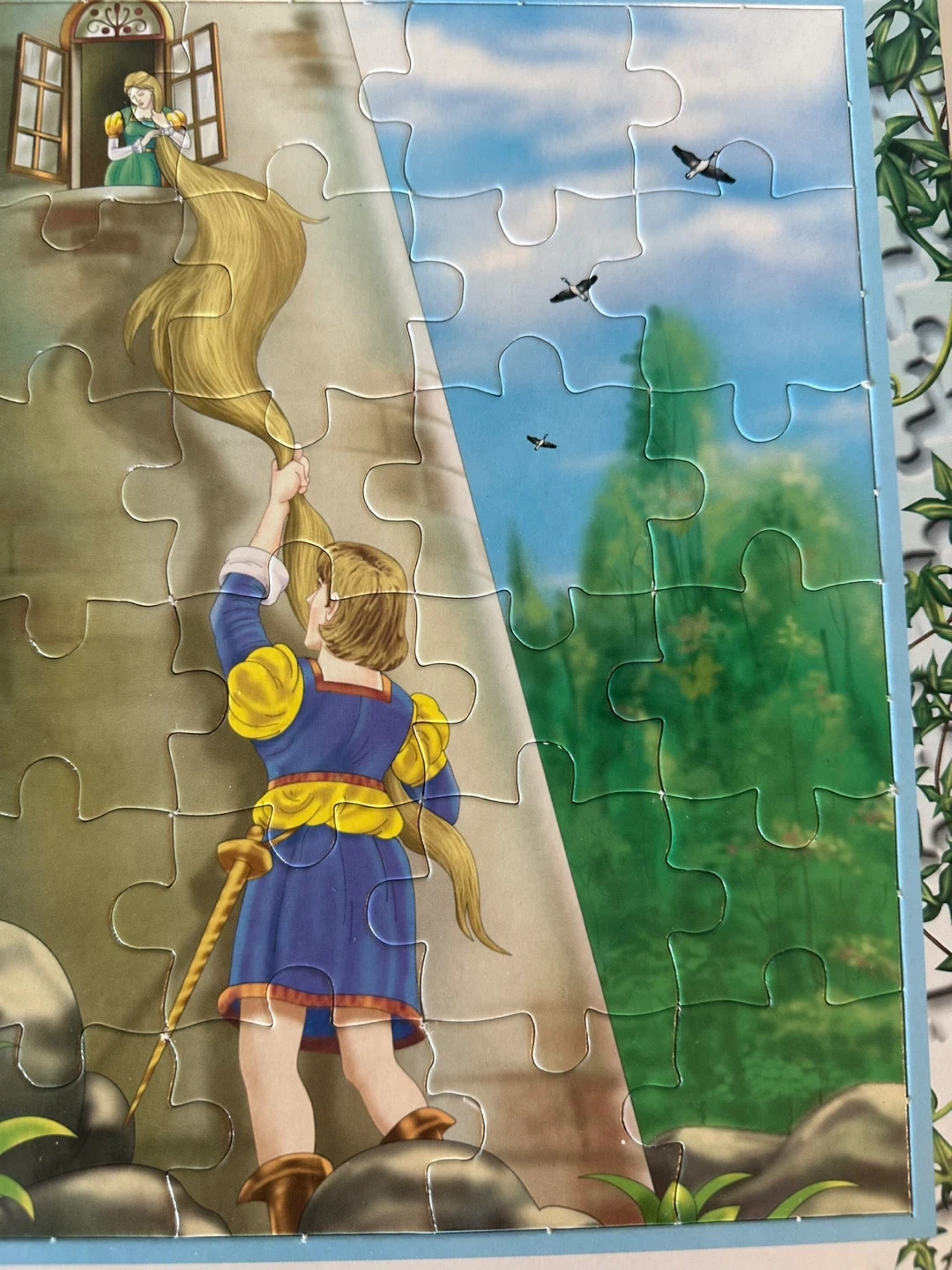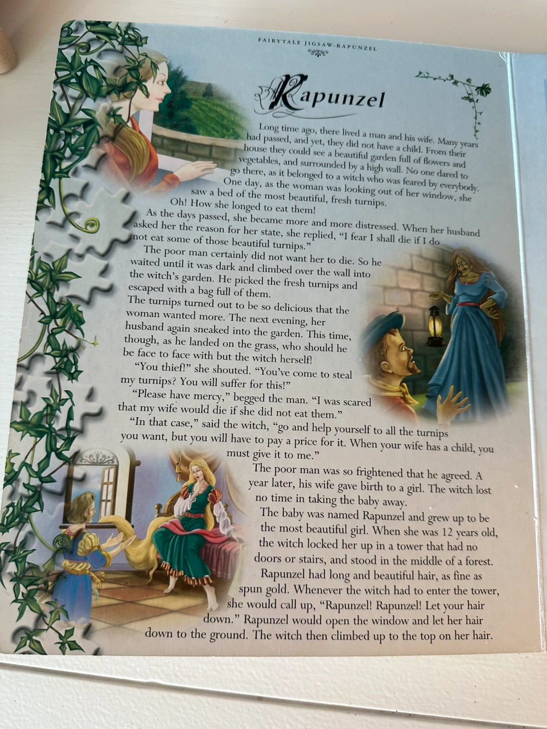 Fairy Tale Jigsaw book It contains six fairy tale puzzles, with each page serving as a puzzle. It is a hardcover book with heavy board pages. This specific edition is known as "Fairy Tale Jigsaw: Snow White and the Seven Dwarfs, Rumplestilskin, Rapunzel". Pick up Windsor Park