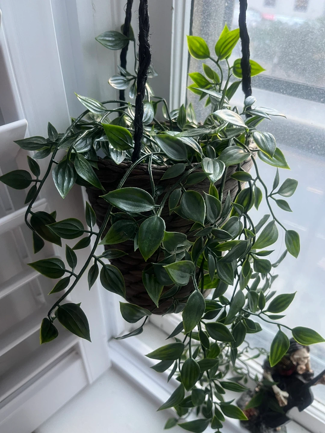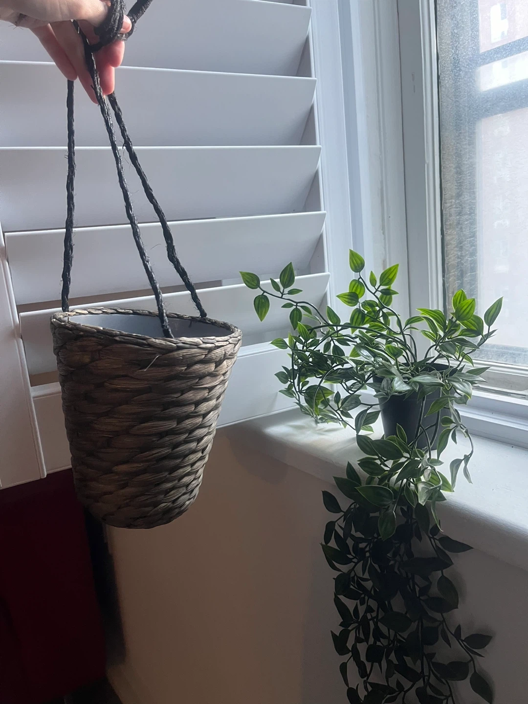 I'm selling a cute hanging plant in a woven basket! It's perfect for adding a touch of greenery to any room. The basket has a rustic, natural look with the fake plant inset included. From Ikea.