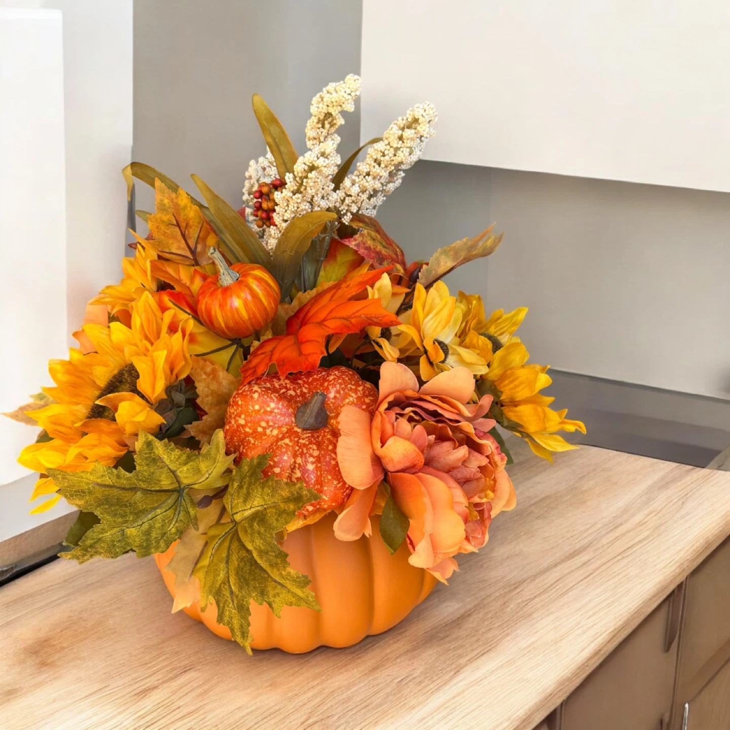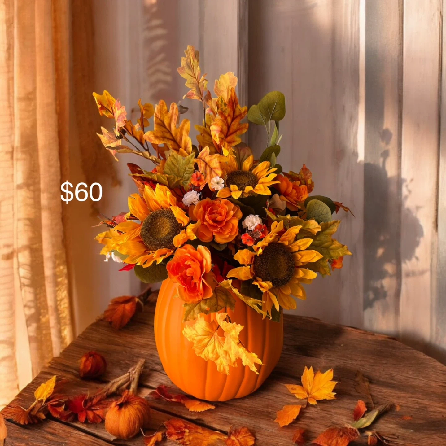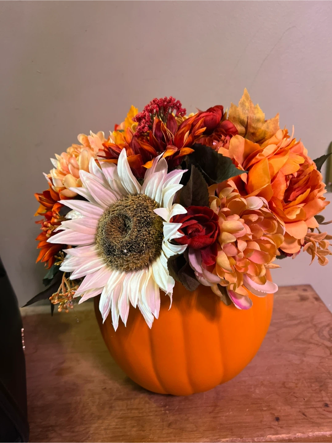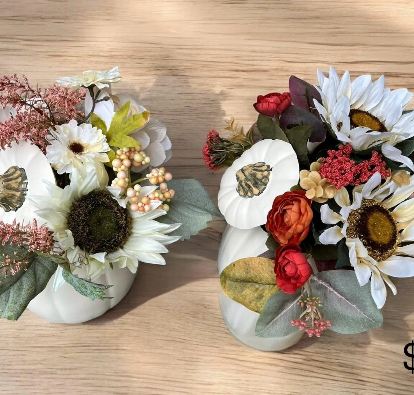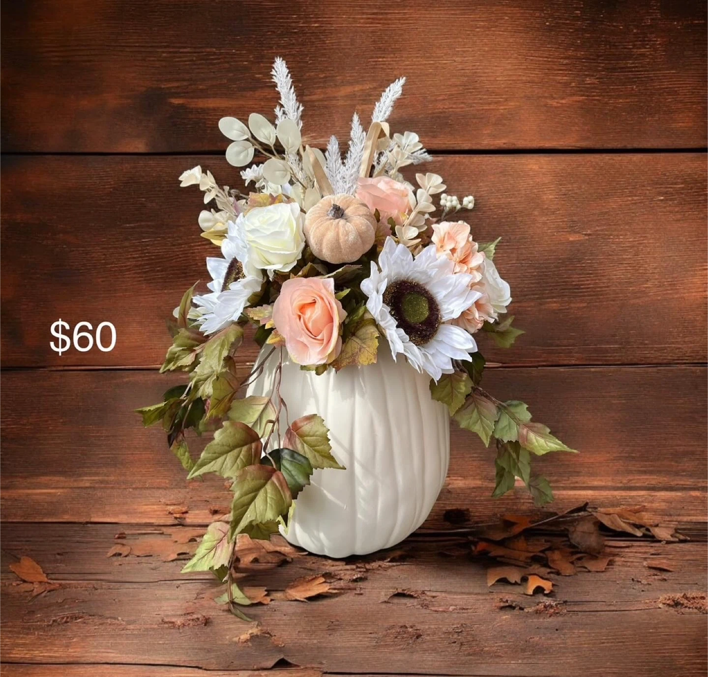 Celebrate the season with a beautiful floral pumpkin. Each piece is handcrafted using quality faux florals in a foam pumpkin base. Perfect accent for a table or front porch. Sizes available 4”,6”,9” and 13”. All sizes except 4” available in both orange and cream. Please note that pics shown are of last year’s designs, similar designs are available or can be customized to your particular style. Prices start at $25. Located in Whitby