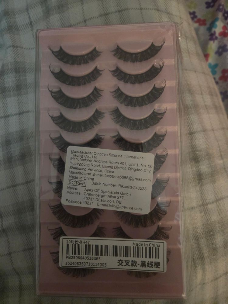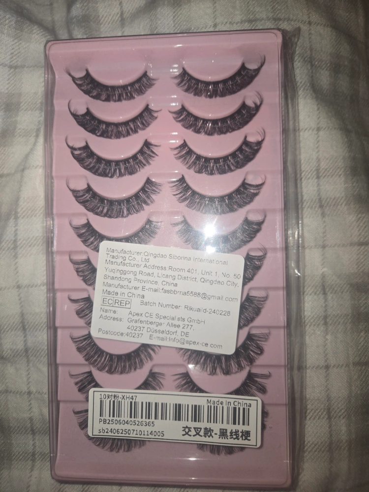 Selling a set of false eyelashes. They are black and come in a pack of 10 pairs.