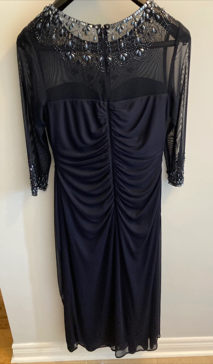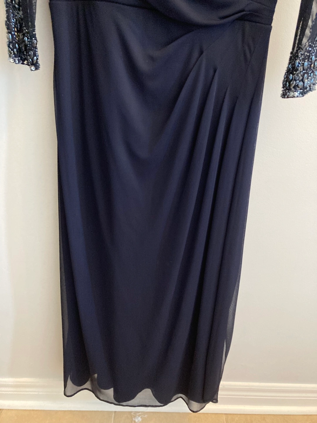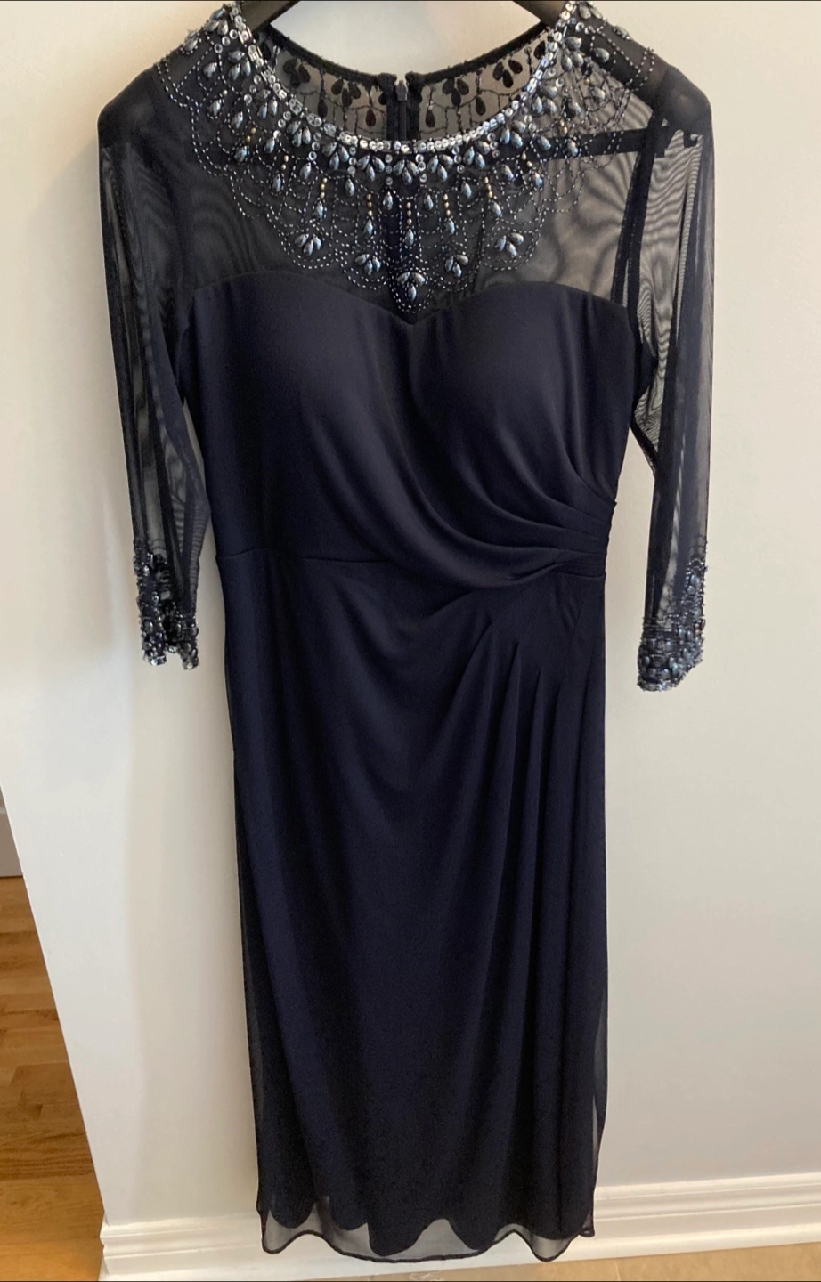 Used once and cleaned. Size 8 Navy blue lined dress with sheer polyester fabric beaded neckline and arms with beading at the cuff. Zipper closure. Ankle length dress hemmed fitting 5’ woman. Excellent condition. Stouffville pickup