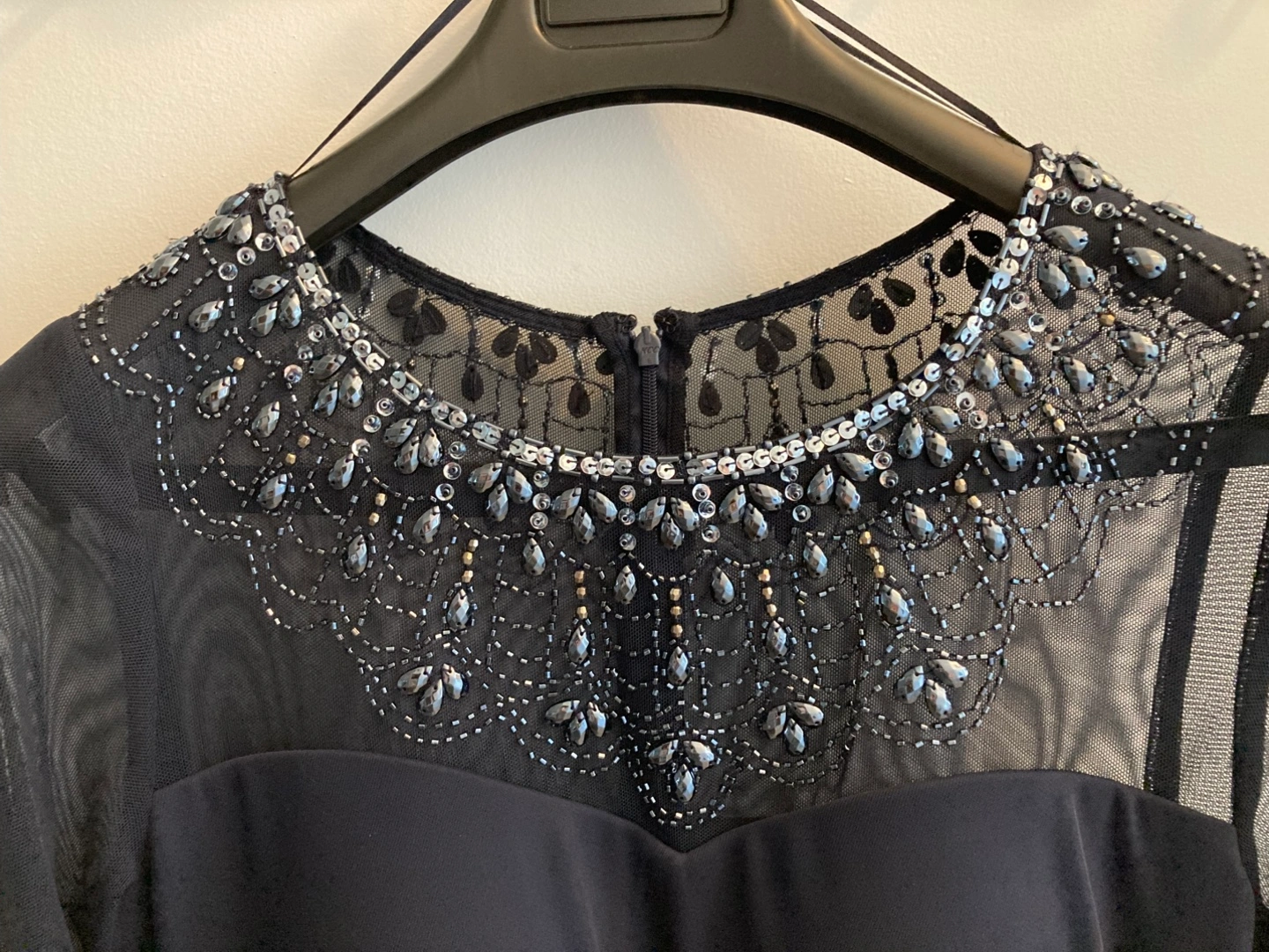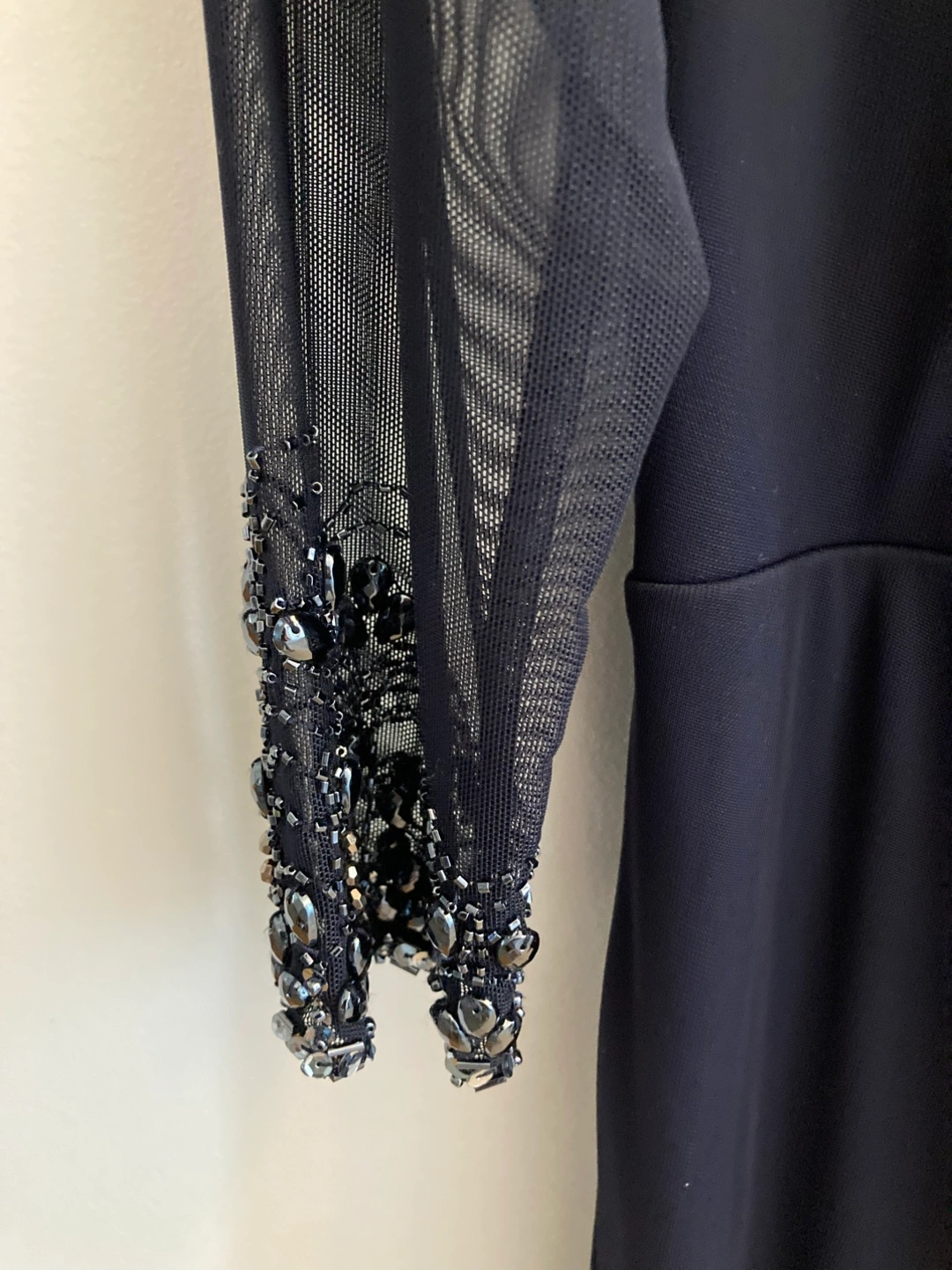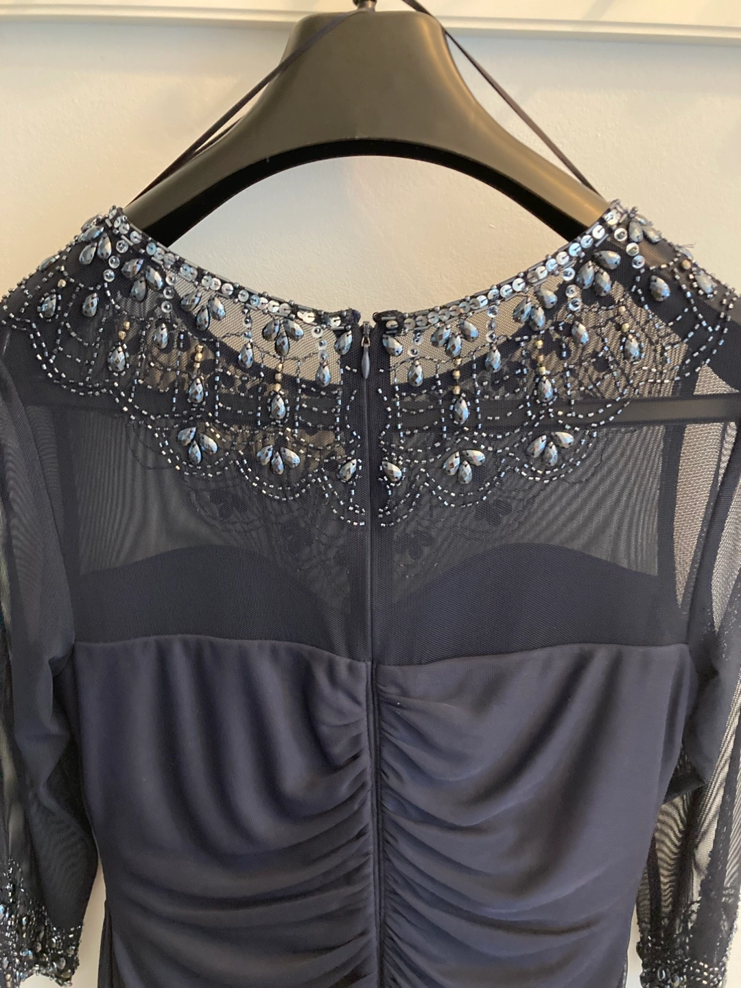 Used once and cleaned. Size 8 Navy blue lined dress with sheer polyester fabric beaded neckline and arms with beading at the cuff. Zipper closure. Ankle length dress hemmed fitting 5’ woman. Excellent condition. Stouffville pickup