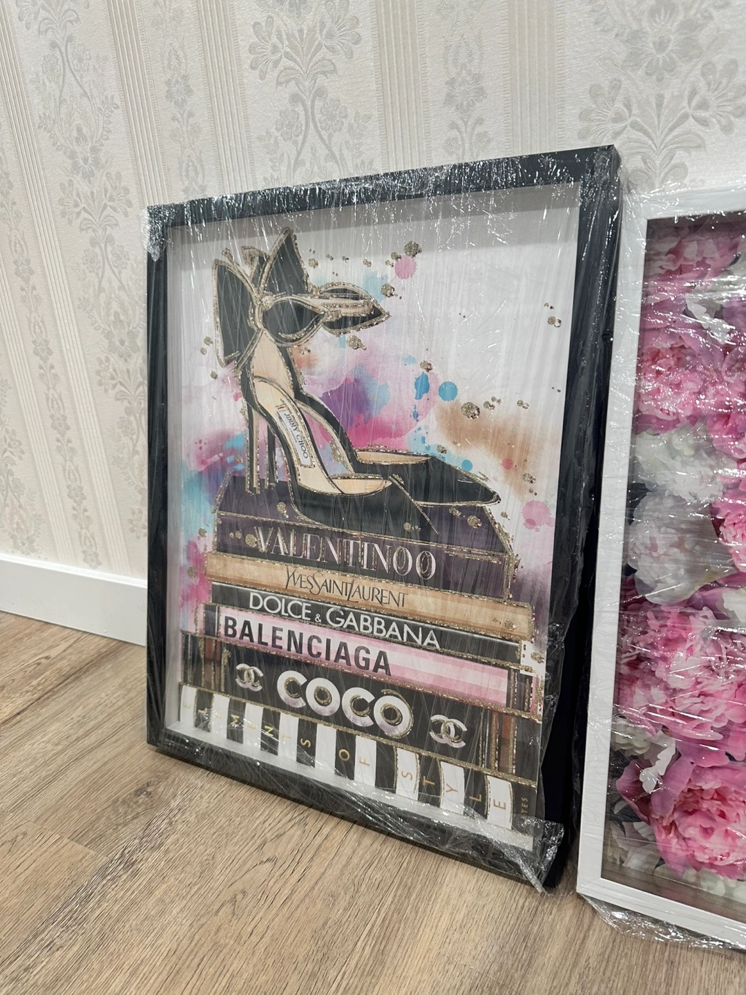 Framed art featuring fashion books like Valentino, Yves Saint Laurent, Dolce & Gabbana, Balenciaga, and Coco, topped with a stylish shoe