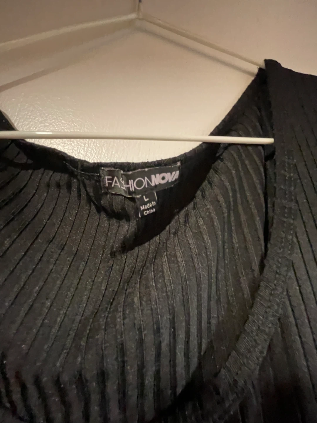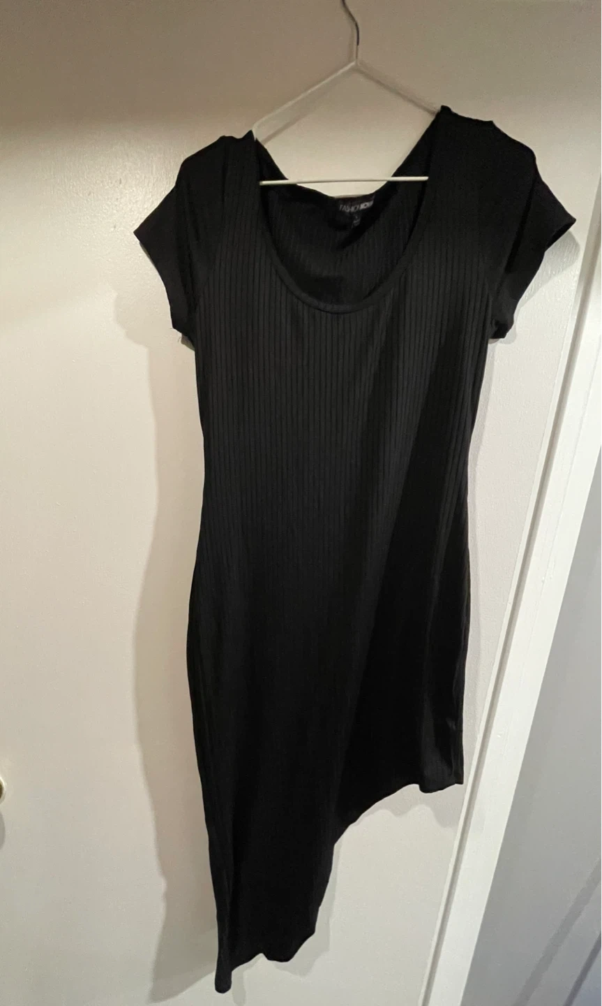 Selling a cute black dress from Fashion Nova! It's a size large and in great condition. The material is ribbed, and it has a unique asymmetrical hemline. Perfect for a night out or a casual event
