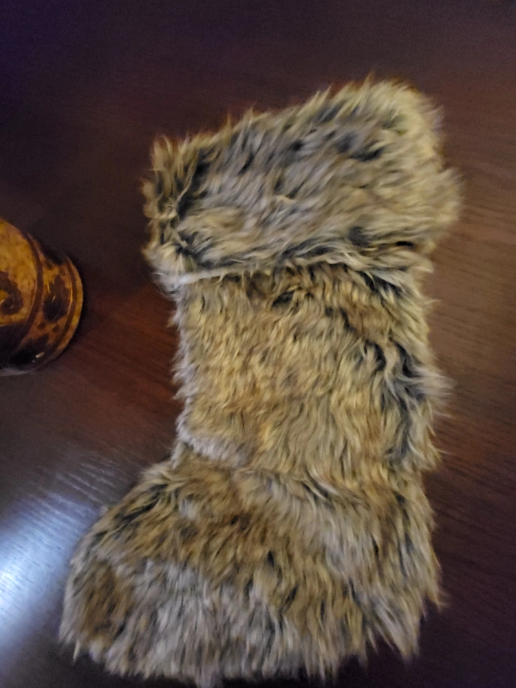 Here's a cozy faux fur Christmas stocking! It's in great condition and ready to hang by the chimney with care this holiday season. The brown colour will add a warm touch to your festive decor