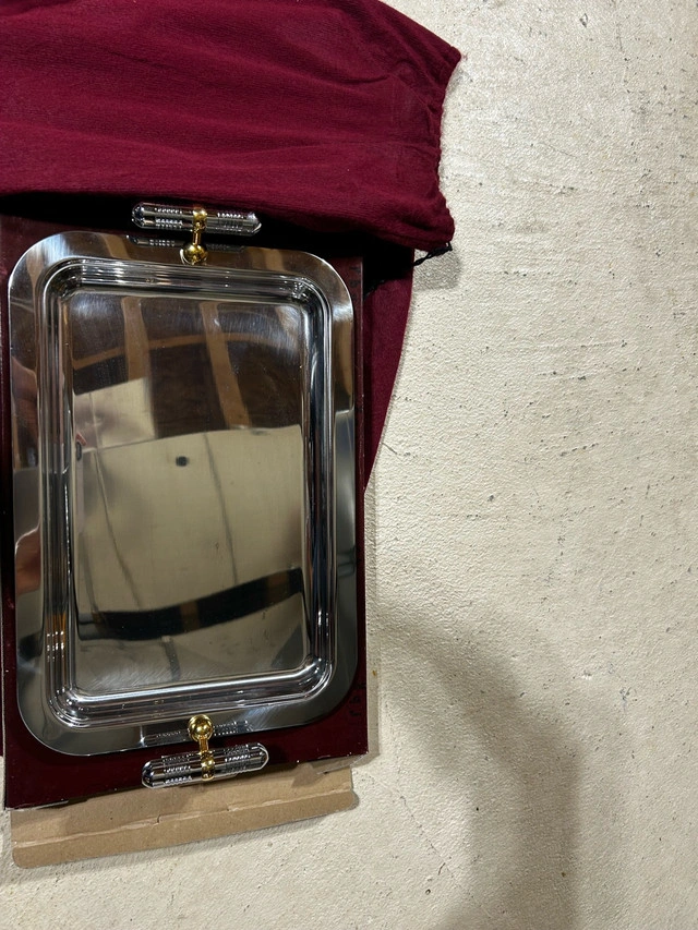 Add a touch of elegance to your serving collection with this FBG serving tray. This tray is designed with a mirrored surface and is great for serving appetizers or desserts at your next gathering. It is in good condition and comes with a protective red cloth cover. * Brand: FBG * Material: Metal * Shape: Rectangular * Colour: Silver