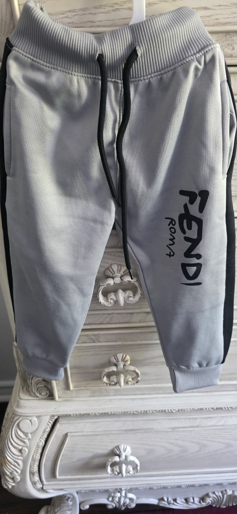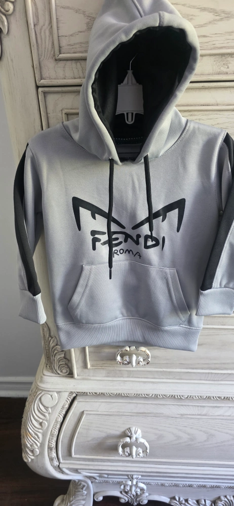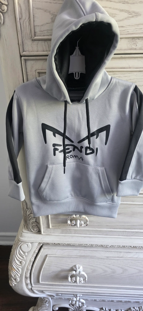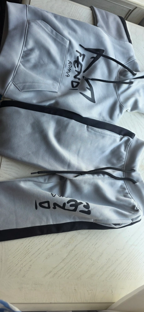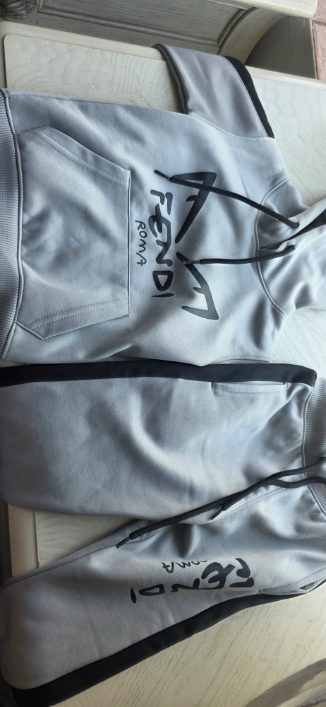 Selling a Fendi Roma hoodie and sweatpants set. The set is light grey with black accents and the Fendi Roma logo on both pieces. Great for casual wear!