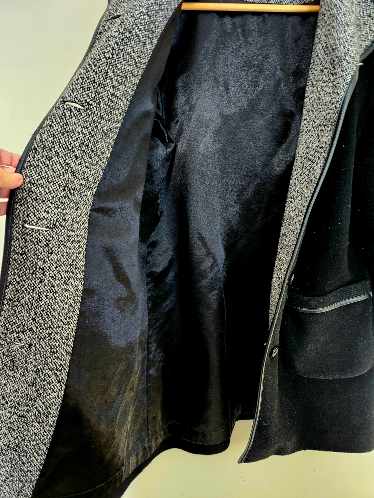 Super warm black wool women's coat. Size 10. Features a grey tweed collar and cuffs. Black satin lining. Two pockets. Button closure.