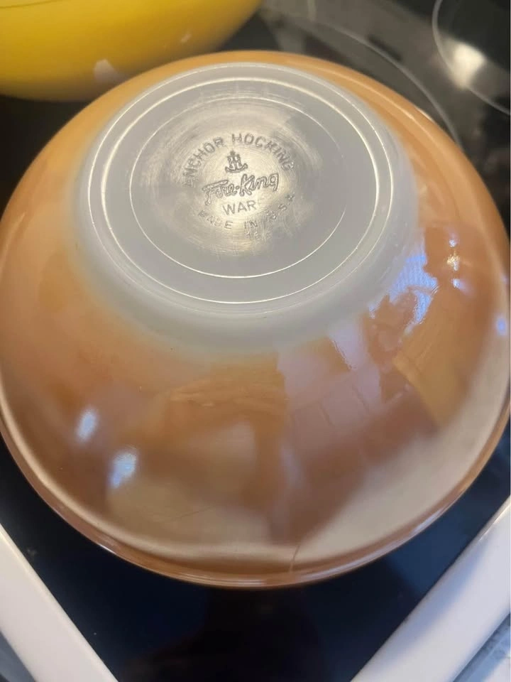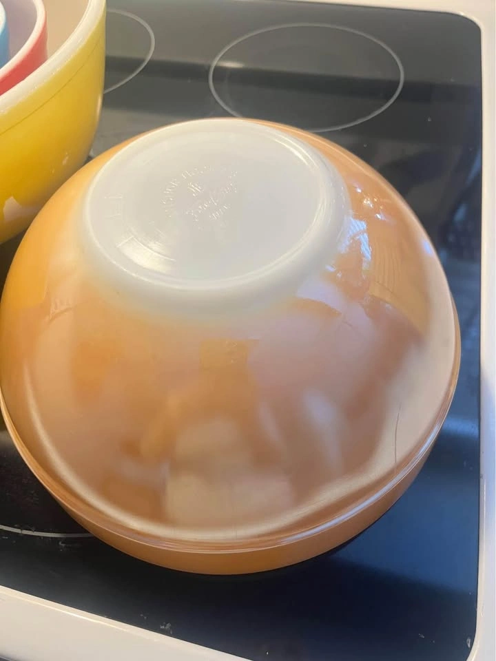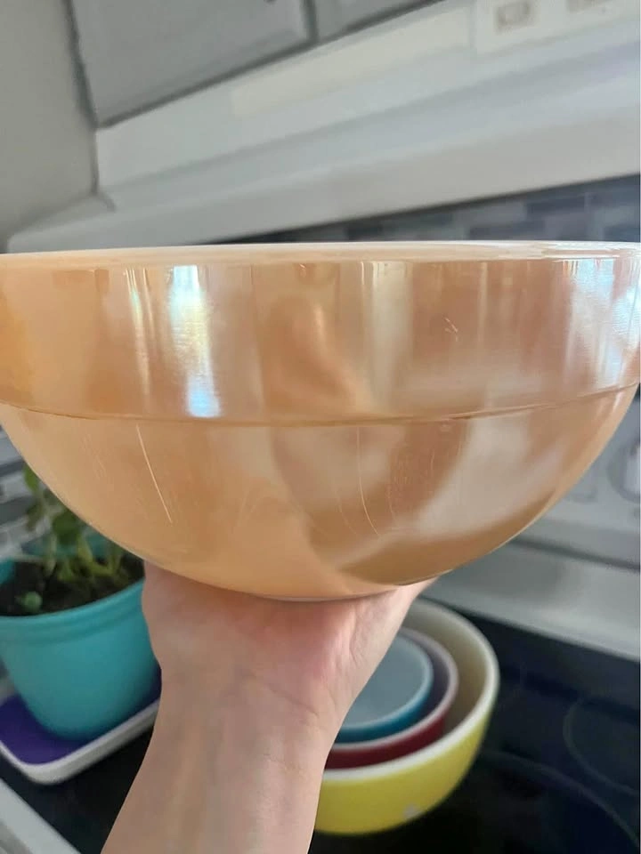 Vintage Fire King bowl in peach lustre finish. Mixing bowl, size comparison to Pyrex: 403 (2nd largest bowl) Good vintage condition, no chips or cracks. Pick up: Etobicoke (Martingrove/Silverstone)