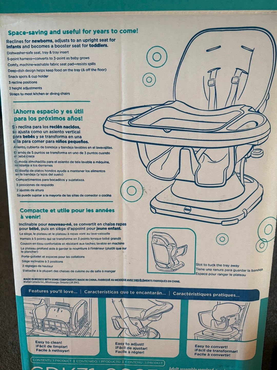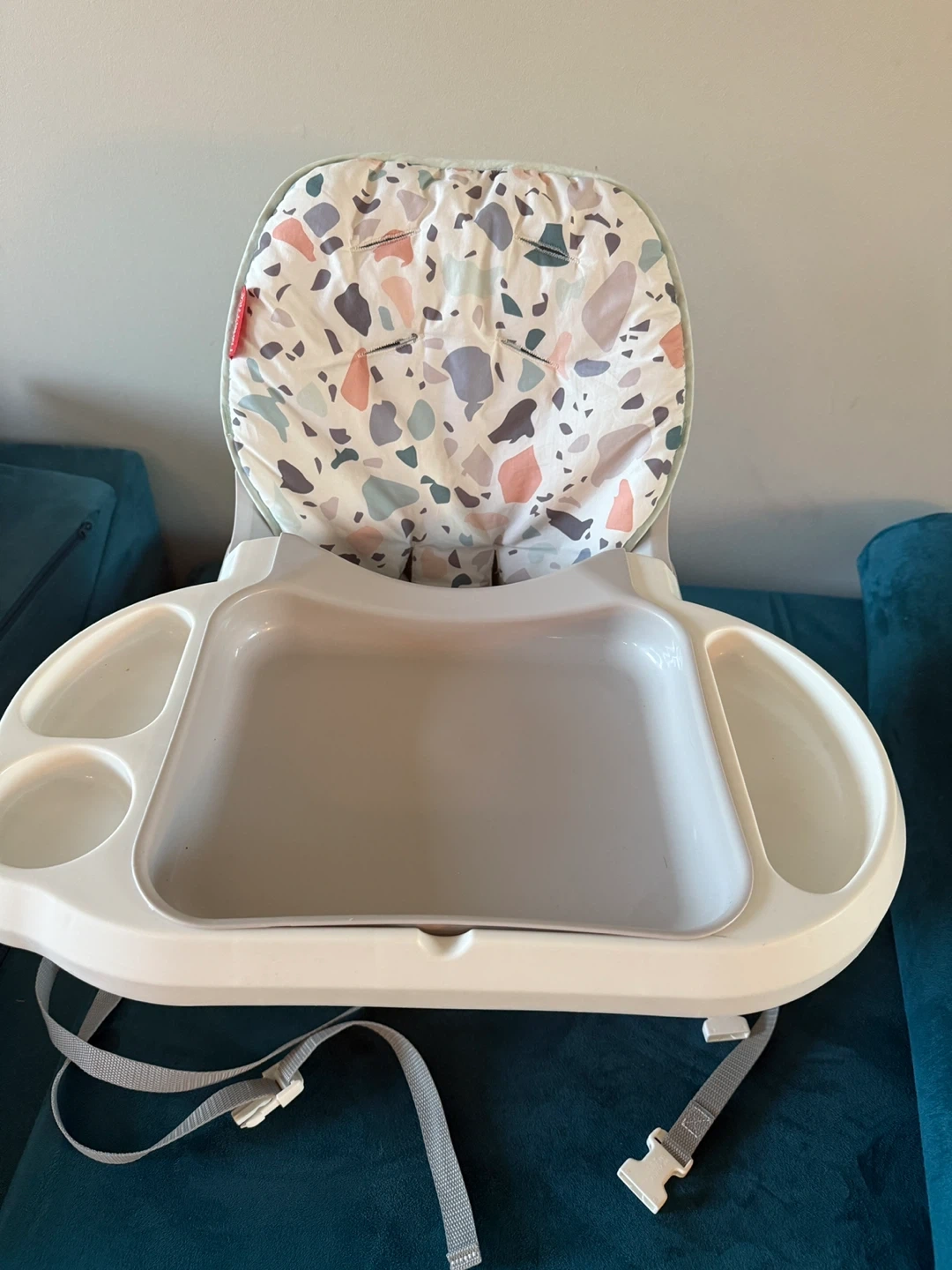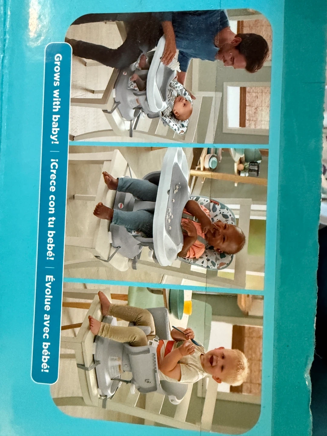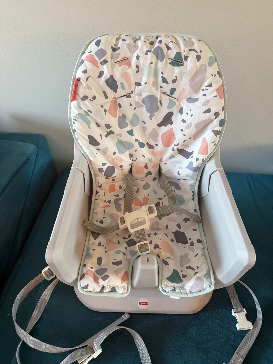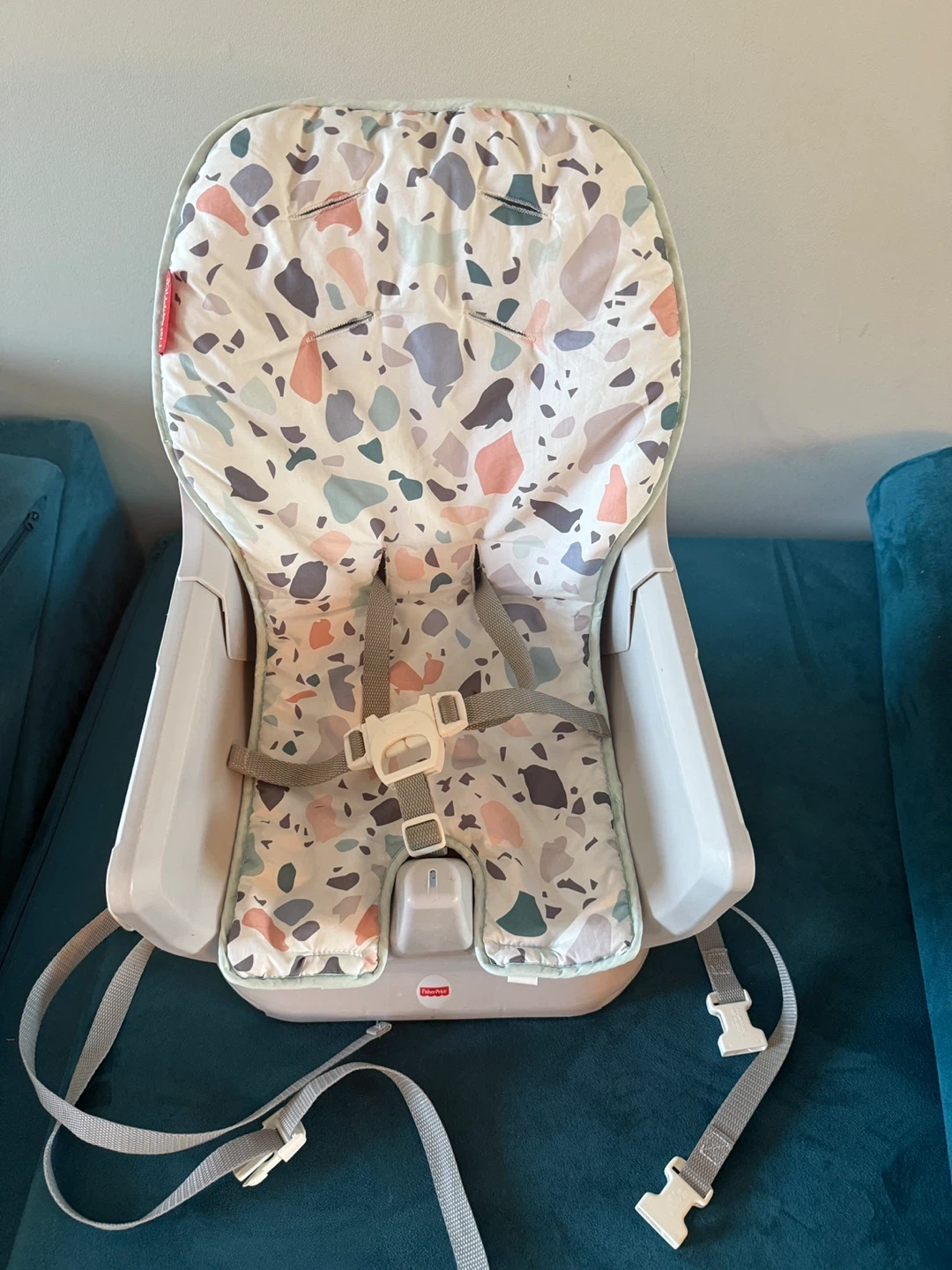 I'm selling a Fisher-Price 4-in-1 Total Clean High Chair! It reclines for newborns and adjusts to an upright seat for infants and becomes a booster seat for toddlers. Key features include: - Dishwasher-safe seat, tray & insert - 5-point harness grows with baby - Comfy, machine-washable fabric seat pad resists spills - Deep-dish design helps keep food on the tray (and off the floor) - Tray stores at back - 2 recline positions - 2 height adjustments - Straps to mount kitchen or dining chairs Space-saving and useful for years to come!