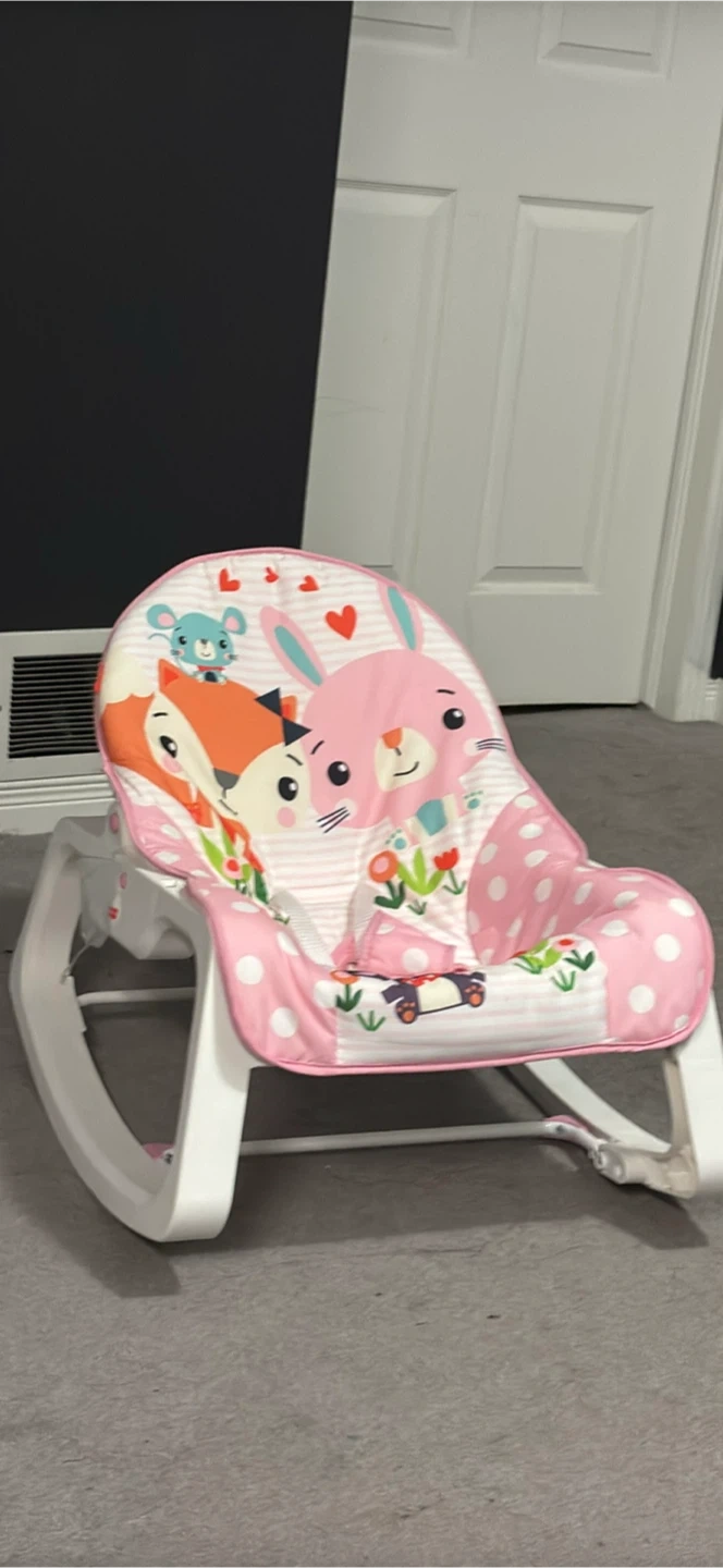 Selling a gently used Fisher-Price Infant-to-Toddler Rocker! It's in great shape and ready for a new home. This rocker is perfect for newborns and can grow with your child as they transition into toddlerhood. The seat is pink with a cute animal design. It's lightweight and portable, making it easy to move around the house