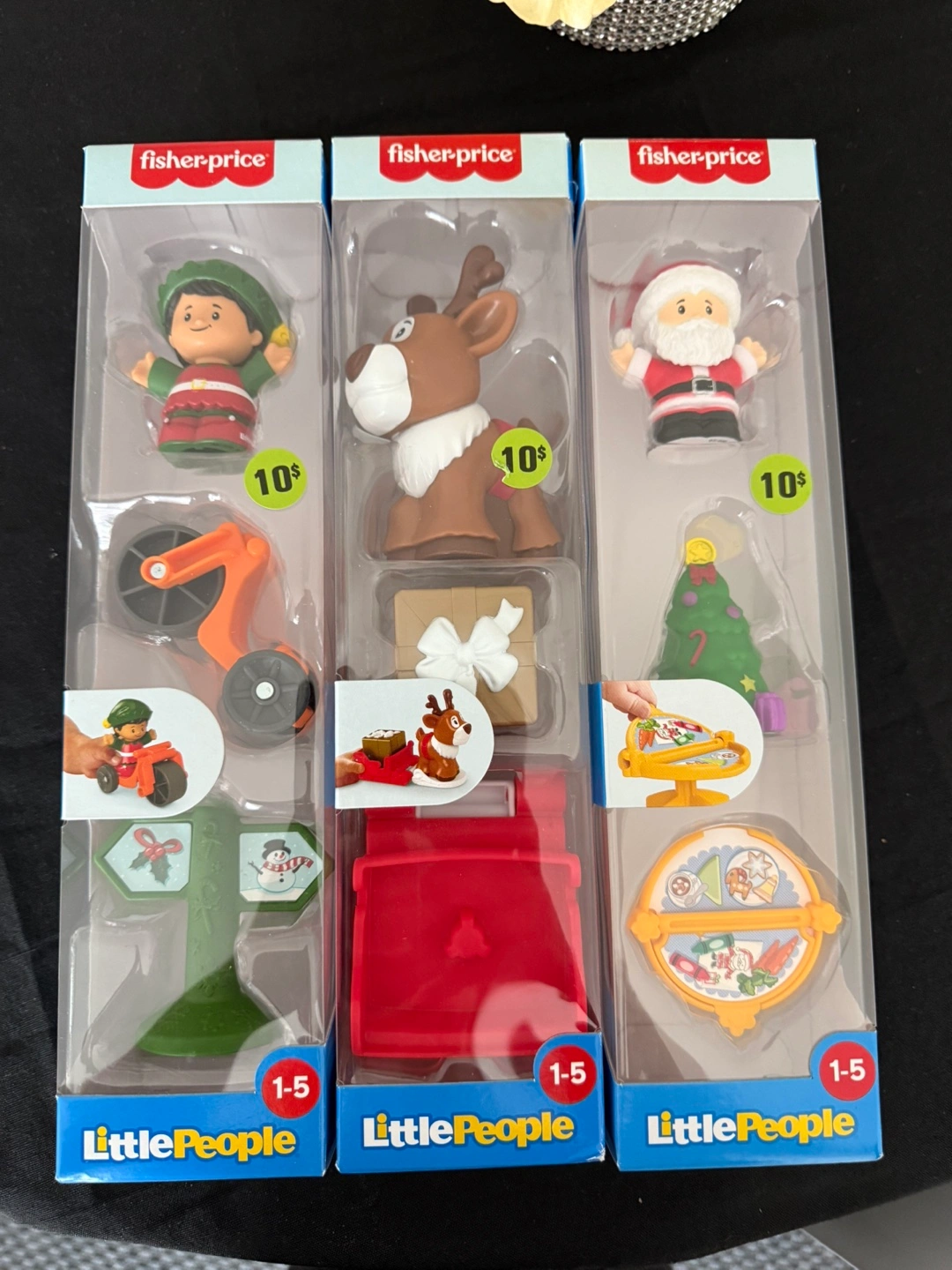 I have three brand new Fisher-Price Little People Christmas-themed figures for sale! These are great for kids aged 1-5. Each figure is priced at $10.