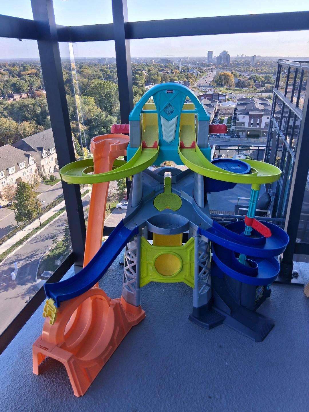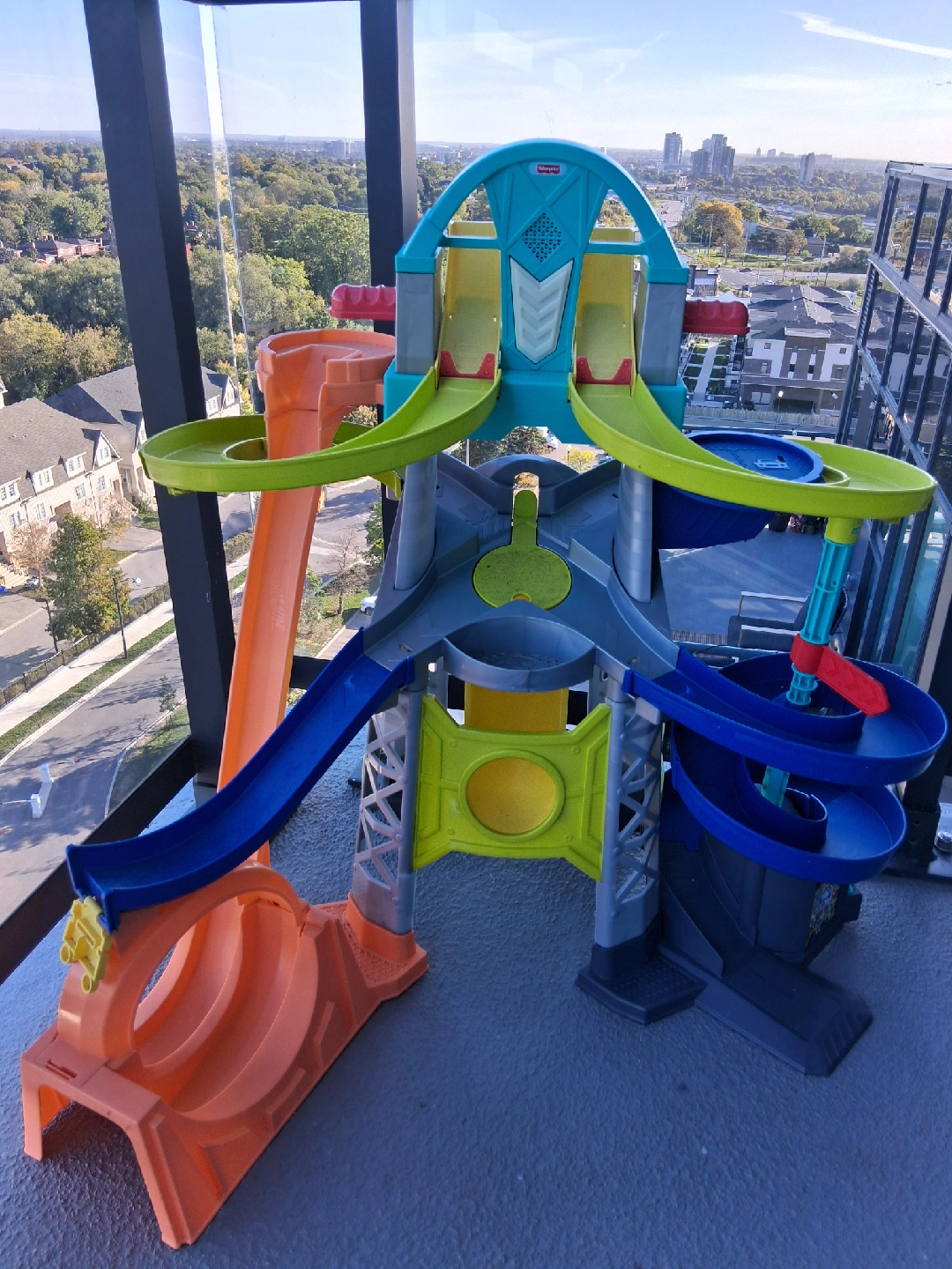This is a Fisher-Price Little People Launch & Loop Raceway! It's a fun and interactive toy for kids, featuring multiple tracks and launch points for endless racing fun. Let your little ones enjoy hours of imaginative play with this colourful and engaging playset