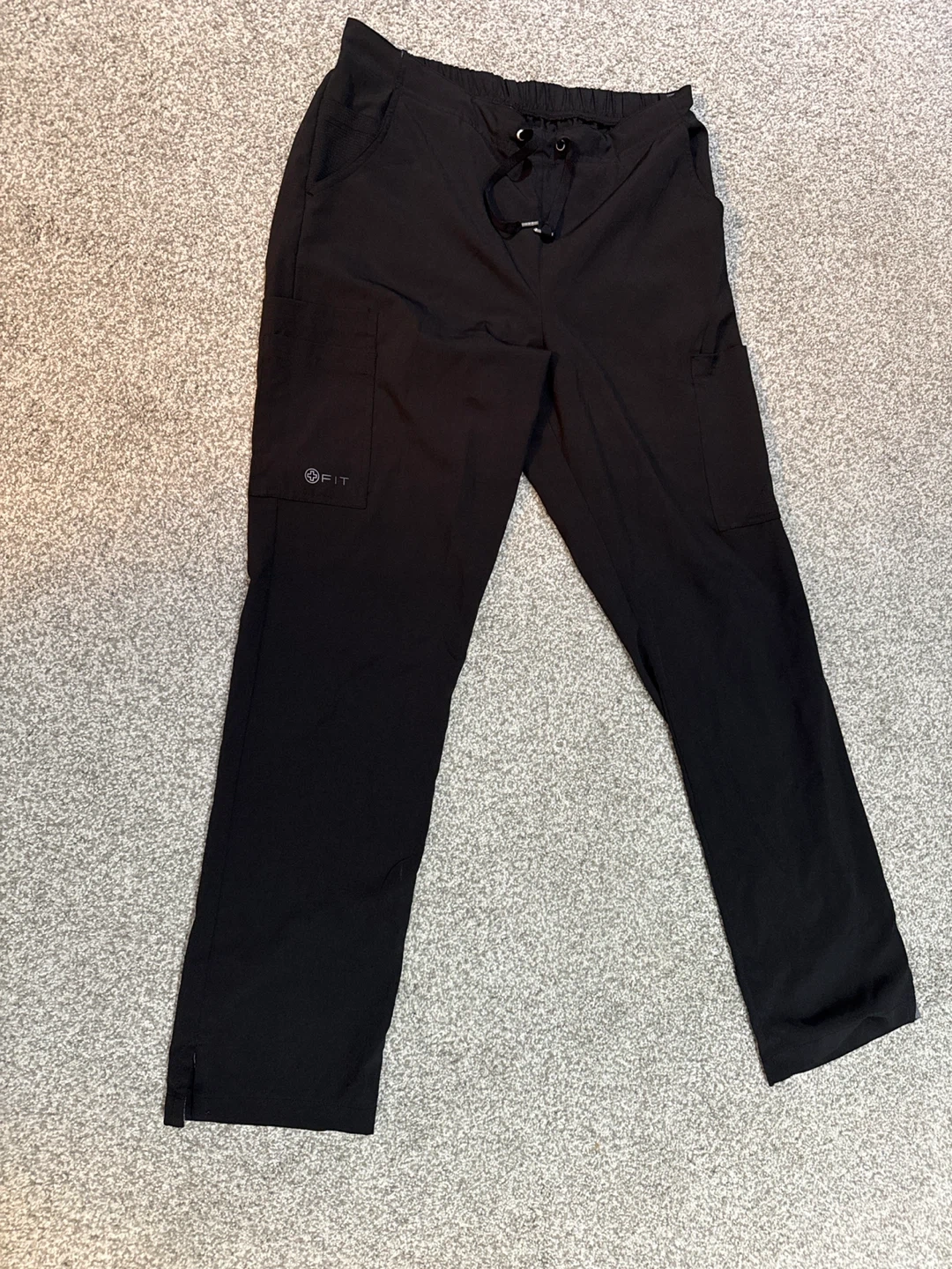 Selling a pair of black scrub pants from Fit! They are in great condition and have a drawstring waist for a comfortable fit. Perfect for healthcare professionals or anyone needing comfortable, durable pants for work