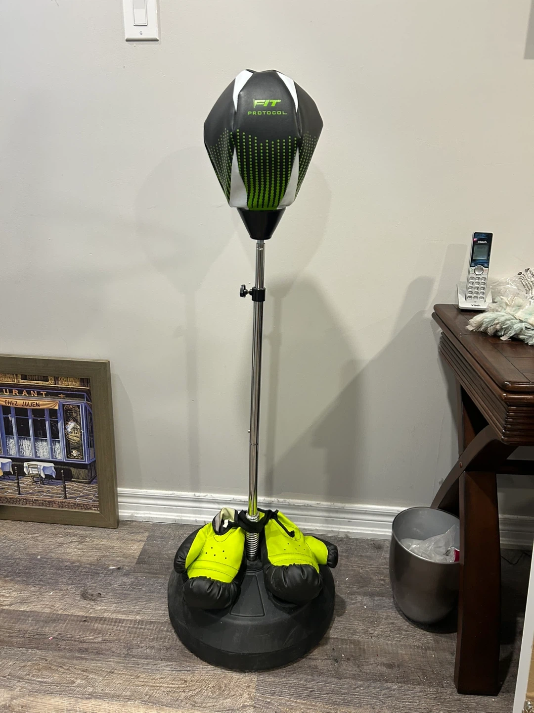 Get your workout on with this FIT Protocol reflex boxing set! It includes a reflex bag, adjustable stand, and a pair of boxing gloves. Perfect for improving your speed and reflexes at home