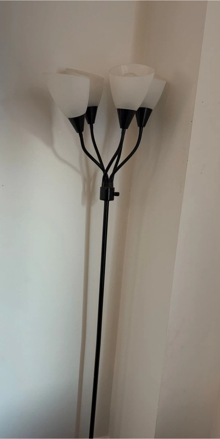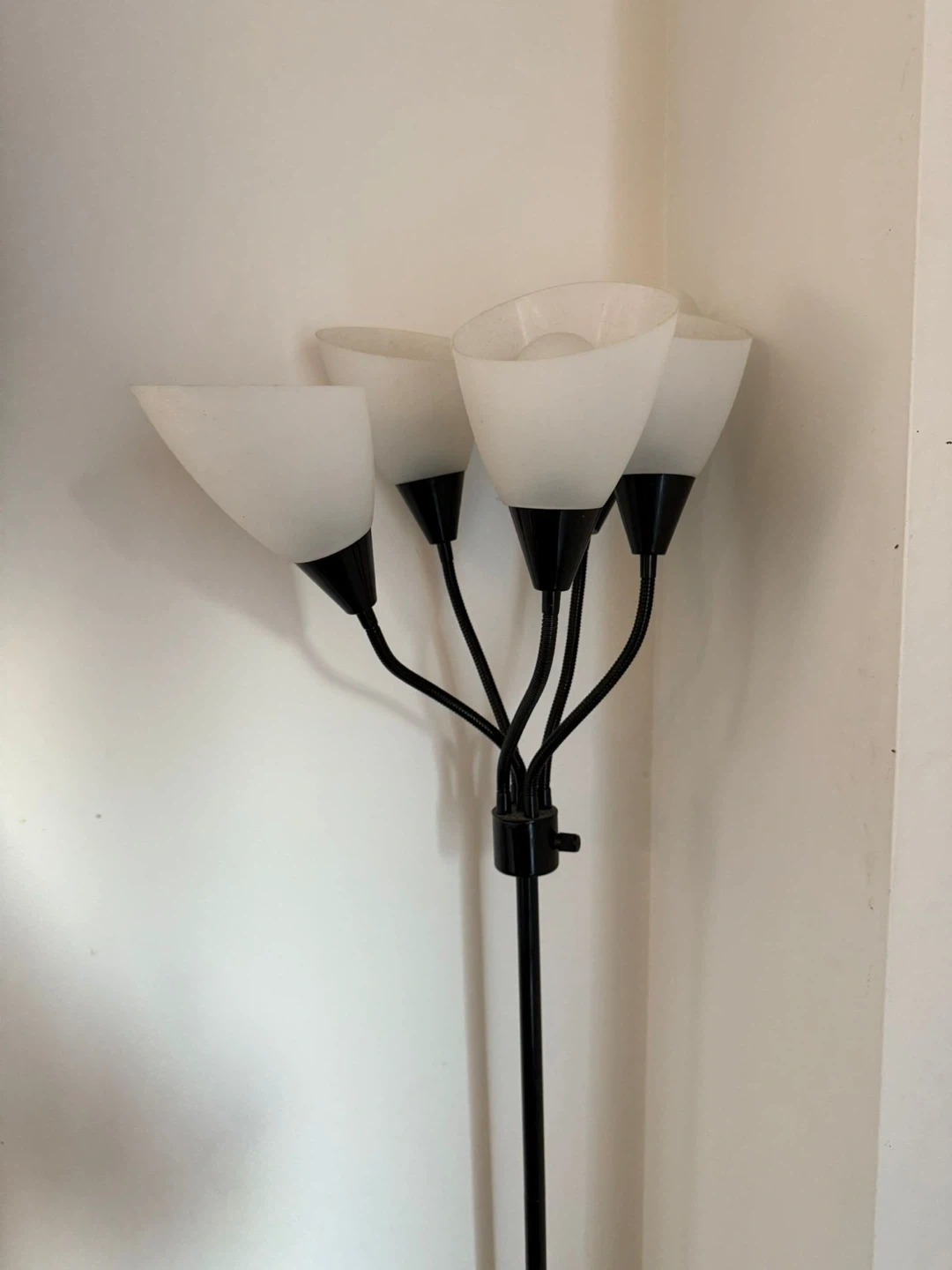 Selling a floor lamp with 5 lights. It features a sleek black design that would fit well in any room. It's in great condition and ready to brighten up your space