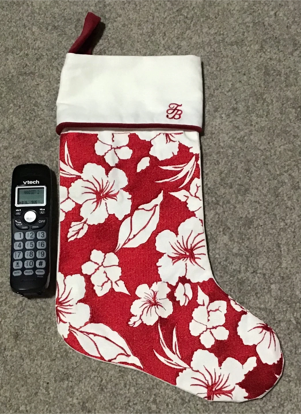 Here's a festive Christmas stocking with a lovely floral pattern! It's perfect for adding a touch of holiday cheer to your home. The stocking features a red and white design with floral accents. As is, info in photo $10.00 exact cash only Maybe good for a sewer to adjust it if needed Back is just white, no pattern Phone to show size