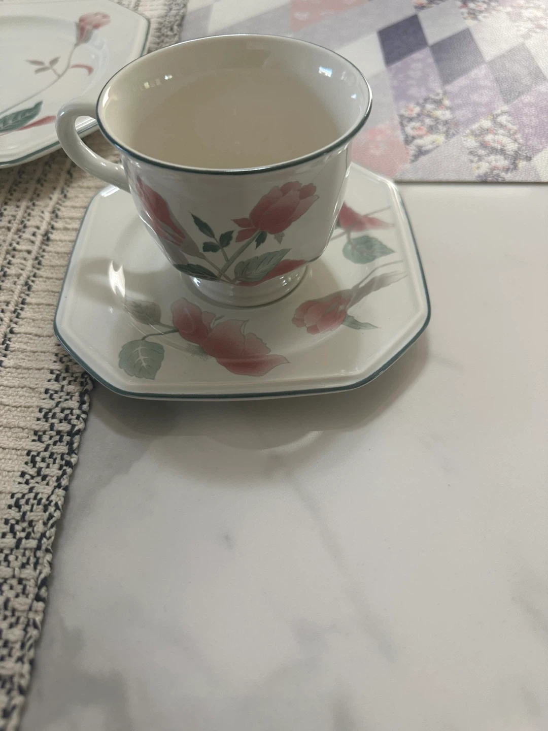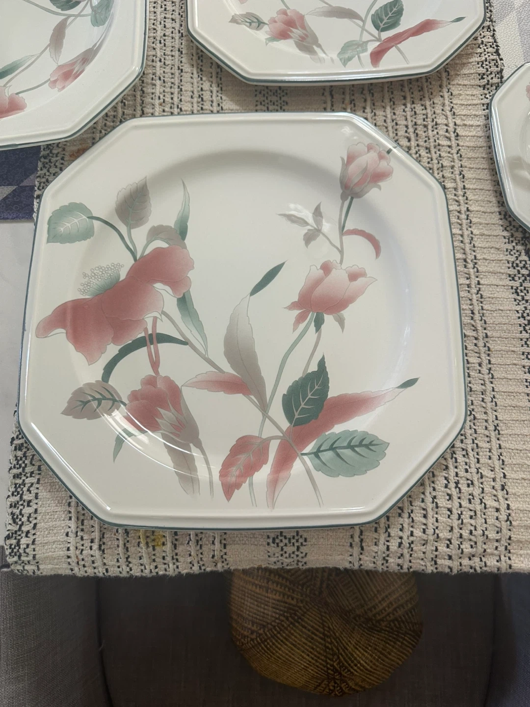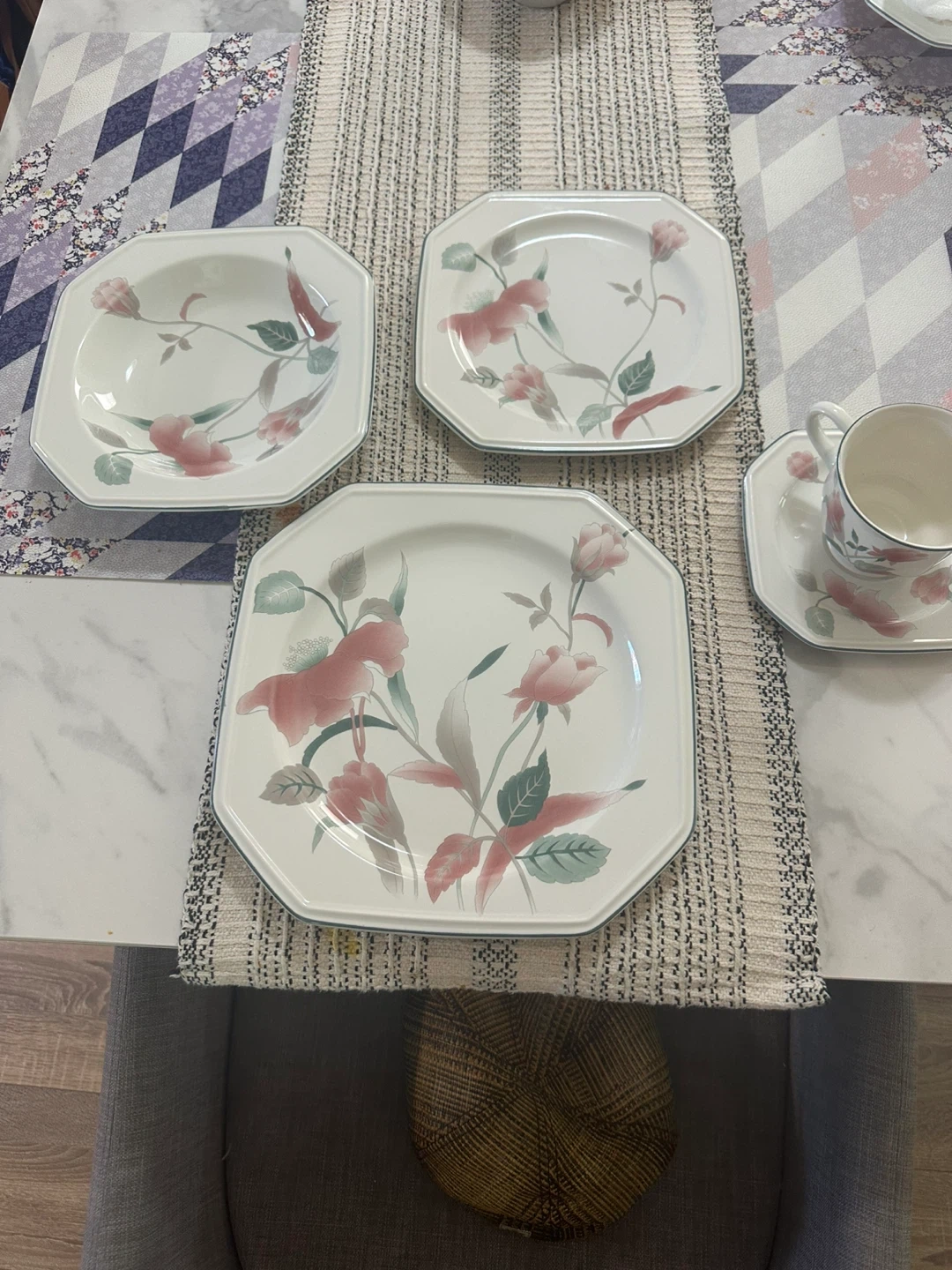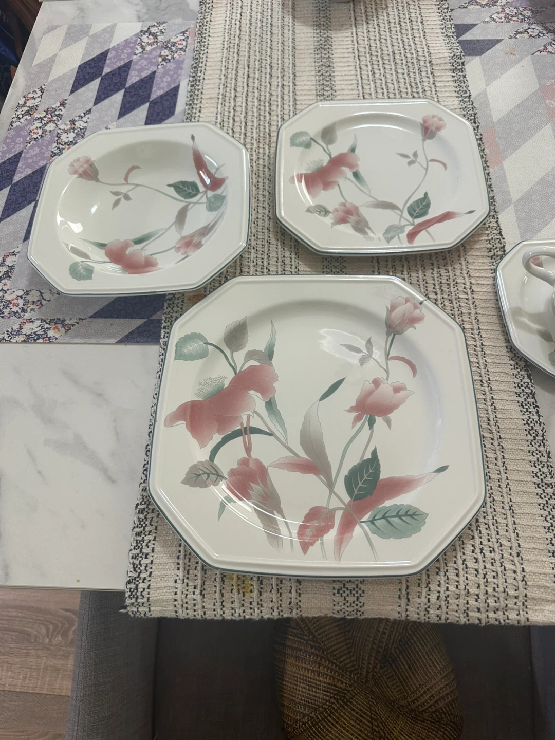 Selling a beautiful floral dinnerware set! It includes plates, bowls, and teacups with saucers. The set features a lovely floral design with pink and green accents on a white background. Perfect for adding a touch of elegance to your dining table! This is a Mikasa setting for 4 people.