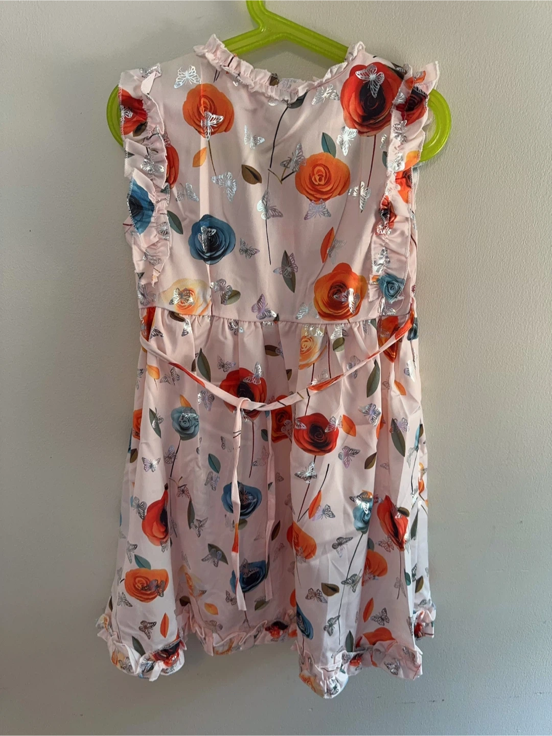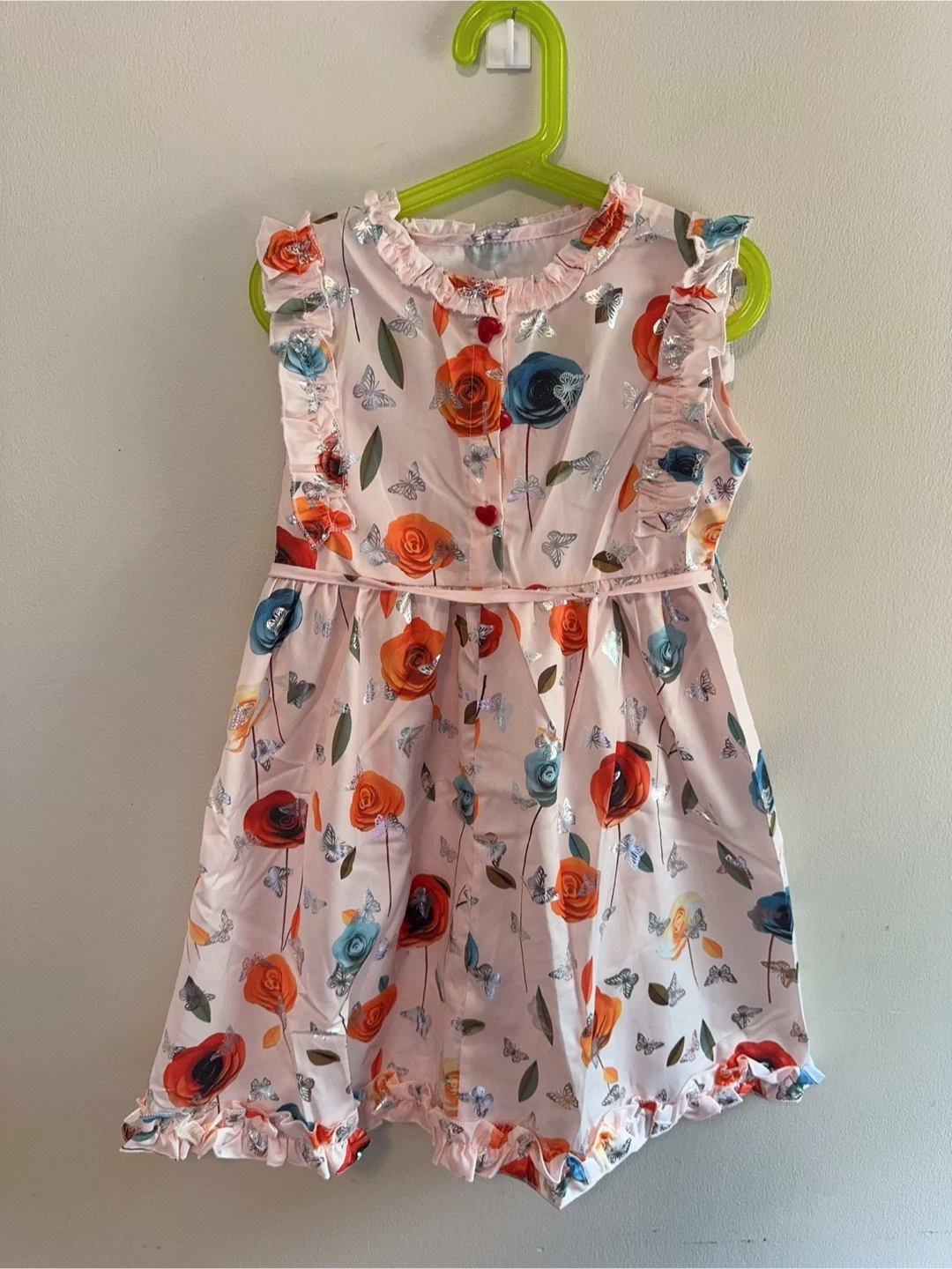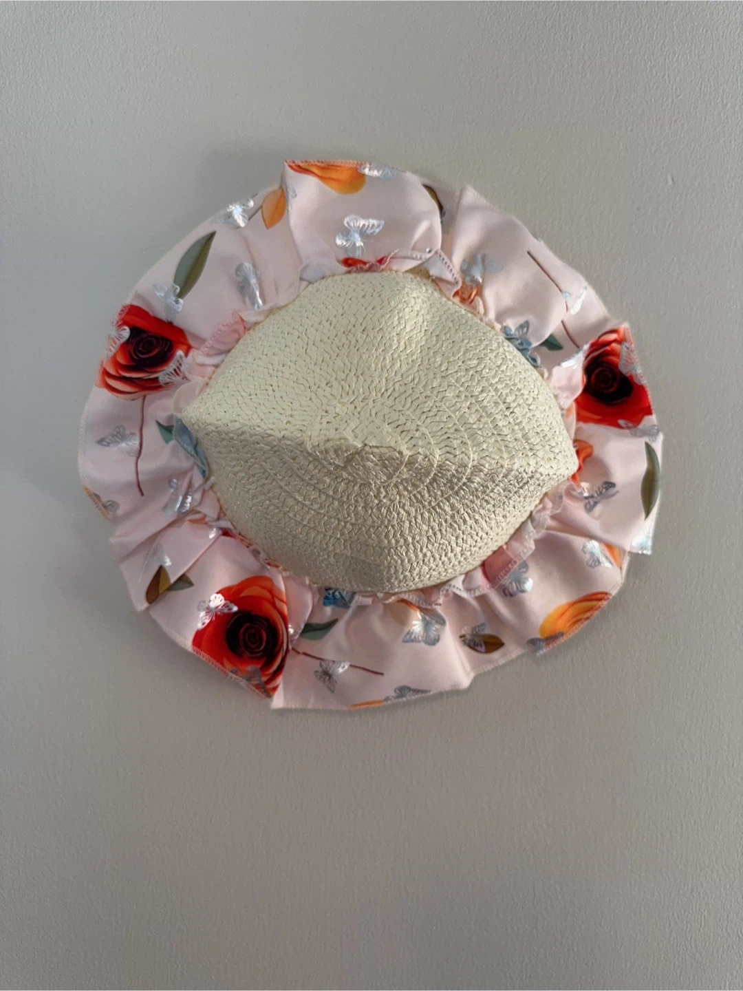 A cute matching dress and hat set! The dress is sleeveless with a ruffled neckline and hem, featuring a floral and butterfly print. It also has a matching belt. The hat has a straw top with a floral brim to match the dress. Perfect for a sunny day!