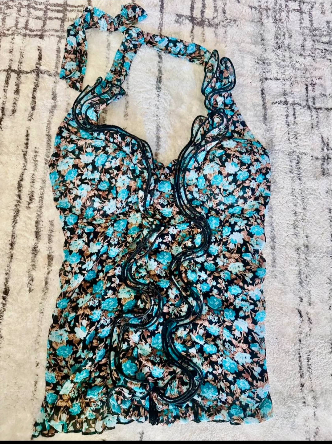 Cute floral halter top, perfect for summer! It features a smocked bodice and tie halter neck. The material is lightweight and comfortable, great for warm weather. Size is not indicated, but it appears to be a small or medium.